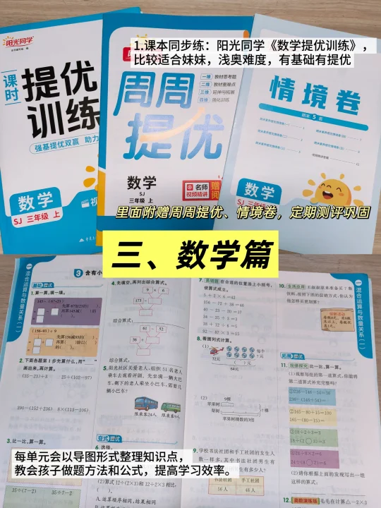 ①课本同步练:阳光同学《数学提优训练》,这个还比较适合妹妹,浅奥难度,有基础有提优,每单元会以导图形式整理知识点,教会孩子做题方法和公式,提高学习效率。里面附赠周周提优、情境卷,定期测评巩固