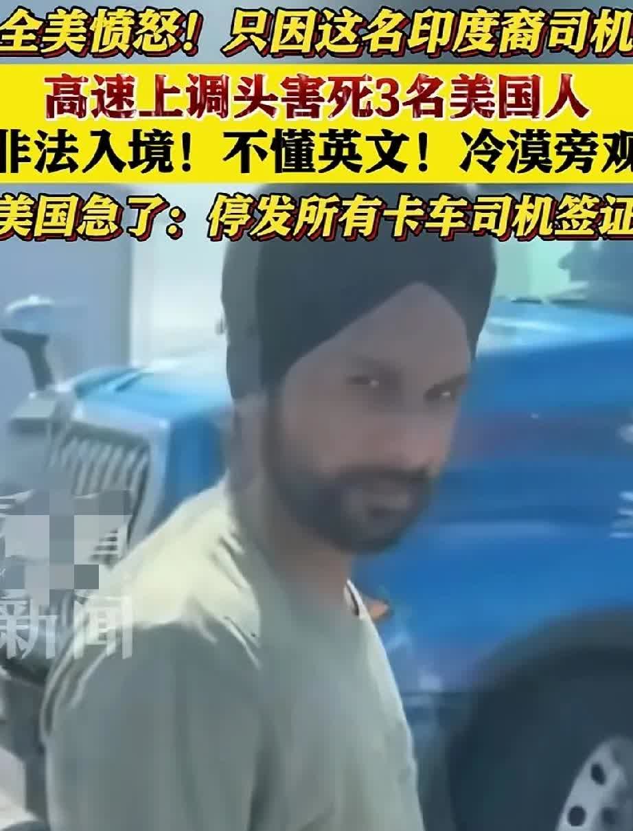 这回全美要掀起抵制印度人的浪潮了 这位印度司机凭借一己之力堵住了所有去美国开卡车司机的活路, 近日这名印度裔司机在佛罗里达高速公路上居然掉头直接导致后车钻入车底, 导致三名美国人死亡, 事故发生后他居然表情冷漠不下车救人,就这样水灵灵坐在驾驶位置上等待救援人员, 这可成功点燃了美国民众的愤怒, 在事后的调查中美国官方更是被震惊, 这司机居然非法入境,不懂英文, 最离谱的是居然看不懂英文标识, 这不是妥妥的马路杀手, 急得美国连忙停止了全美卡车司机签证。 大家对于这位印度司机高速掉头怎么看?