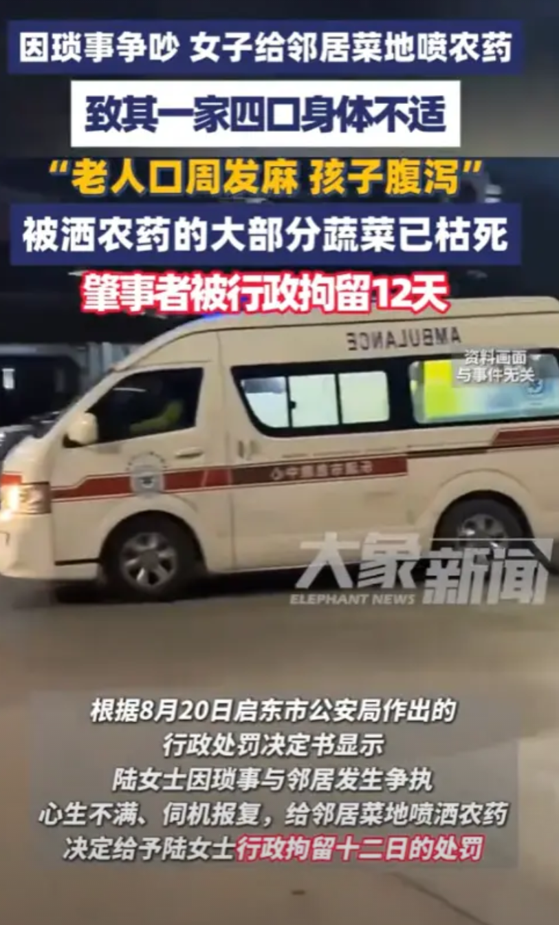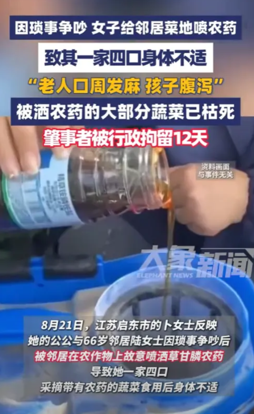 “太坏了!”8月21日,江苏启东,一女子的公公与女邻居不和,曾因为小事争吵,被女邻居记恨在心,趁着别人不注意,偷偷的往女子家中喷洒农药,导致一家四口身体不舒服,恶心腹泻!网友:真是恶毒啊!