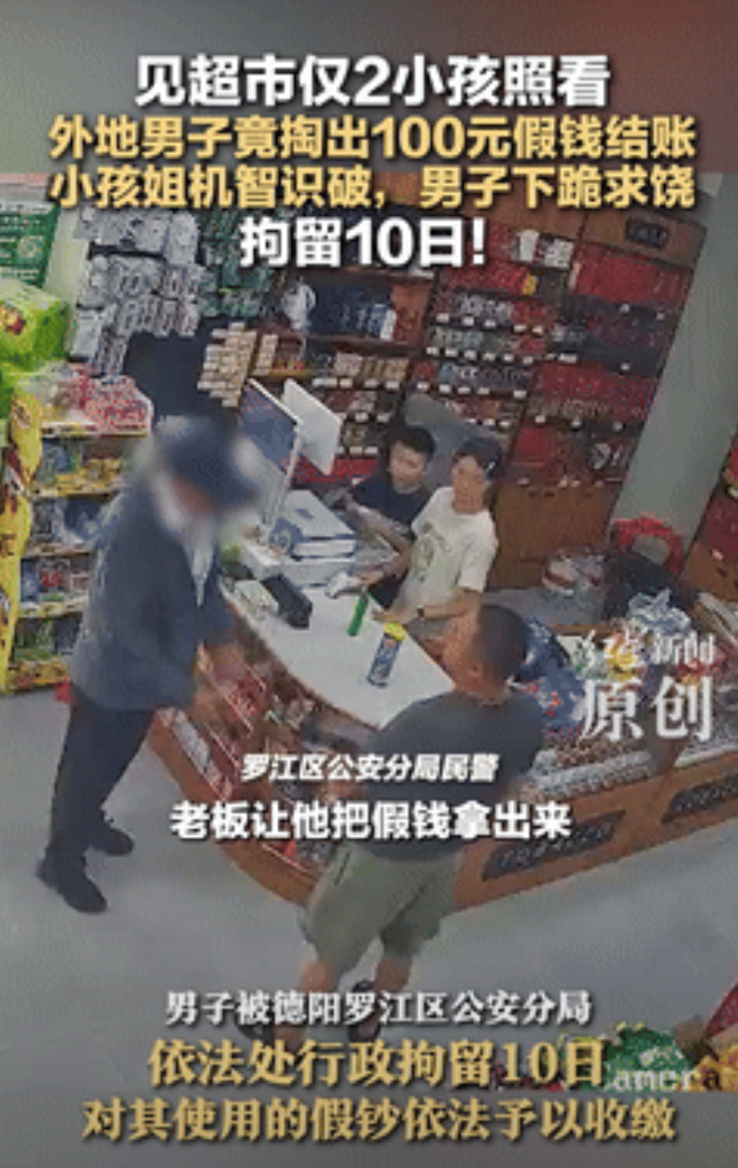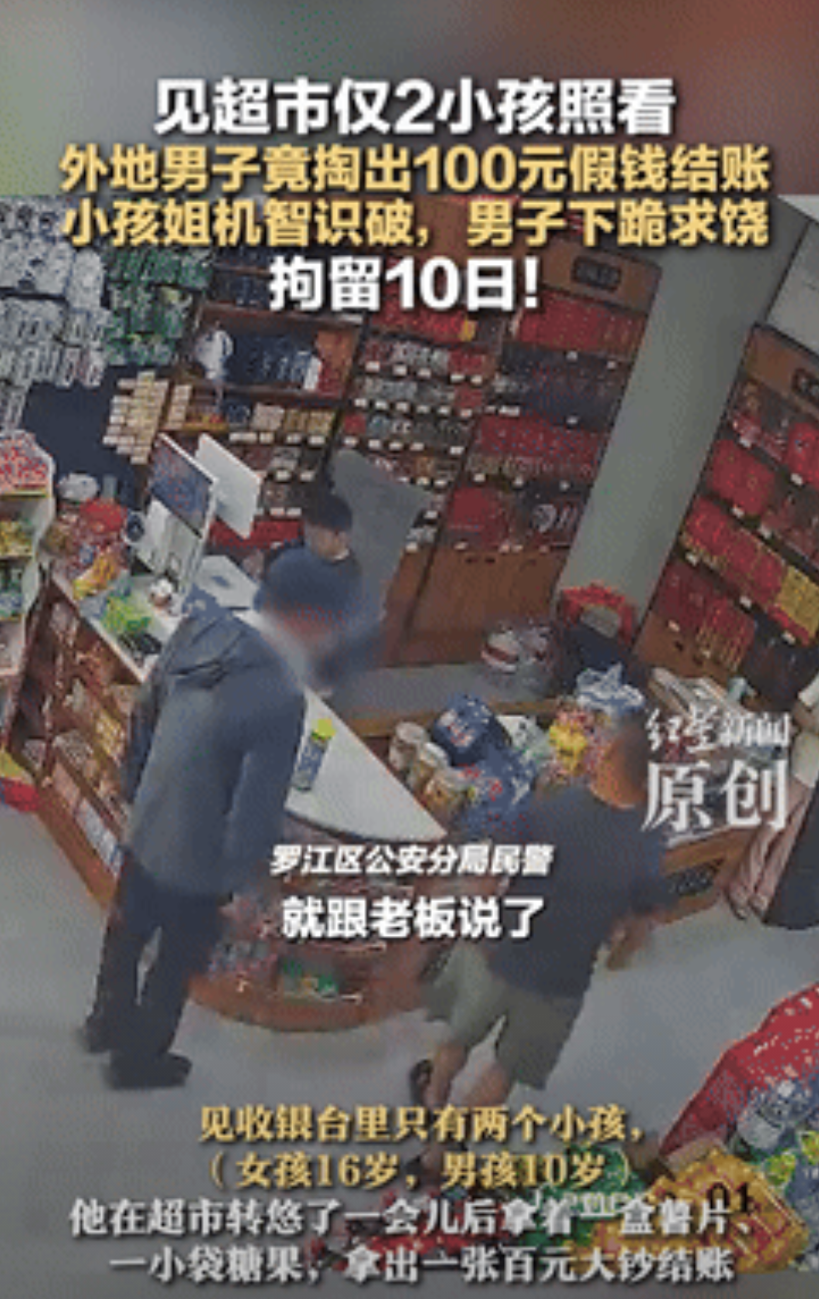 缺德缺冒烟了!四川德阳,一男子去超市买东西,见仅有俩小孩看店,竟掏出100元加钱结账,不料,却被小孩姐机智识破,并喊家长过来,可男子下一秒的举动,却让人意想不到! 据红星新闻8月22日报道,当男子在超市里,逛了好几圈之后,就拿了两包零食,准备到前台结账。 不过,在看到前台只有俩孩子在,旁边并没有大人的时候,他就动起来歪心思,从兜里掏出了个百元假钞,准备行骗。 然而,虽然孩子的年龄并不大,但也并非什么都不懂,当把钱接过来之后,仔细看了下就发现了不对劲。 就在他俩还在钻研假钞时,男子可能是慌了,想要把钱给抢回来,却遭到了孩子的阻拦,听到动静的家长,也赶紧过来查看情况。 当家长了解完情况之后,就准备打电话报警,不料下一秒,男子竟直接下跪,并把真钱拿出来结账,祈求能够饶他一次。 但是这一招对于家长来说,却不是那么好使,坚持选择去报警,并时刻看着男子,以免让他逃跑了。 就这样,民警来到超市后,就把男子给带走了,随后根据根据他的行为,对男子做出拘留10天的处罚。 不得不说,这人坏的真没底线,竟然还想着坑小朋友,这次幸亏孩子很机智,也懂得分辨钱的真假,才没让他得手。 也建议日后能给予这种人严惩,最好是能在里面待一辈子,别在出来祸害人了。 那么对于这件事情,您有什么想说的呢?