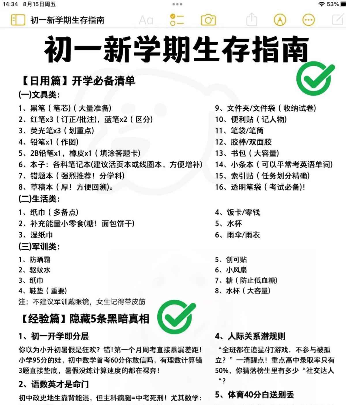 开学第一天,别让孩子哭着找爸妈! 一张录取通知书,10张证件照,3把锁,20个衣架,这些数字背后,是初一新生第一次离家过夜的全部底气。 清单很长,但真正的坑只有三个。第一坑:文具。小学用卡通笔袋,初中老师直接没收,说考试不让带图案。第二坑:宿舍。你以为带被子就行,结果半夜被冻醒,学校发的垫子薄得像煎饼。第三坑:药品。孩子第一次住校,口腔溃疡三天,校医室排队两小时,最后靠室友给的西瓜霜续命。 我见过最惨的案例,是杭州妈妈林莉。她按清单买了全套进口文具,结果儿子第一天就把圆规弄丢,被老师罚抄十遍几何定义。林莉连夜开车送新的,儿子却哭着说:妈,我想要的是你的备忘录,不是你买的笔。 所以,别只盯着物品。真正的准备,是让孩子知道:作业写不完可以问同桌,被子太薄可以借学长的,想家了就给爸妈打电话。清单只是地图,勇气才是指南针。 带得走的是行李,带不走的是成长。