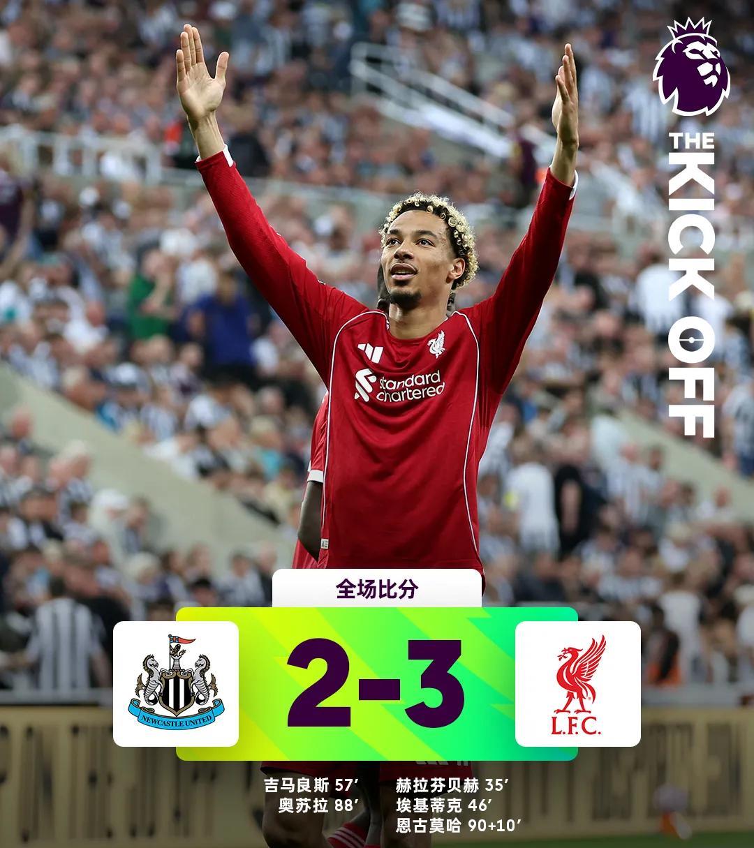 北京时间8月26日03:00,英超第2轮的一场焦点比赛,利物浦客场挑战纽卡斯尔,本场比赛纽卡的吉马良斯和奥苏拉分别打进1球,利物浦的赫拉芬贝赫、埃基蒂克、恩古莫哈打进1球,全场战罢,利物浦客场3:2绝杀纽卡斯尔,利物浦迎来英超两连胜。