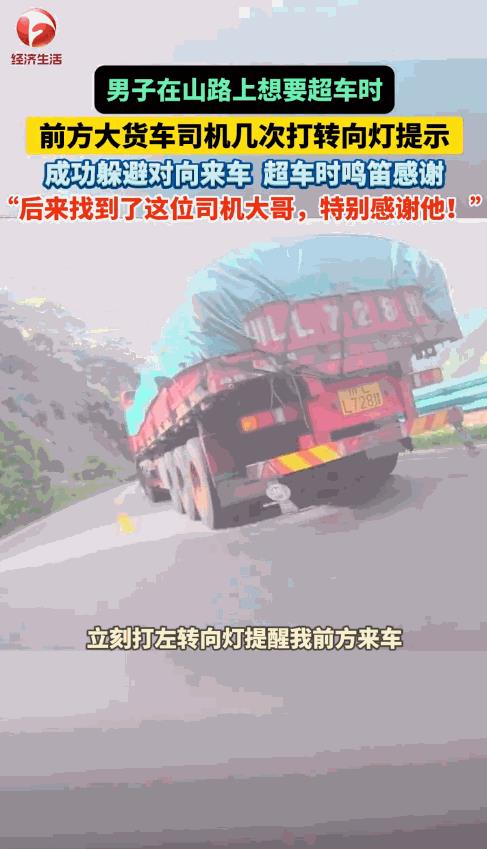 “这就是缘分!”8月22日,四川乐山,一男子骑摩托车在山路正打算超车,前方大货车突然打起了左转向灯,男子意识到前方有情况,于是迅速变了回来,果不其然,一辆汽车呼啸而过!又过了一会儿,货车司机主动刹车,并打起右转向灯示意男子超车。网友:货车司机是个善良的人! 如今,很多年轻人都喜欢骑机车,每逢节假日和周末,就会在周边来一场自驾游,享受骑行的快乐。 这天下午,杜先生骑摩托车出来兜风,由于前方有一辆大货车,而对向车道又经常有车辆驶过,杜先生只能默默跟在后面,影响了自己的速度。 终于,他见对向没有车了,就打算超车,货车司机也看出杜先生的打算,打起了右转向灯,示意他可以超车。 然而,就在杜先生拧紧油门准备加速时,货车又亮起了左转向灯,杜先生知道这是在提醒自己,于是又变了回来。 很快就有一辆汽车疾驰而过,由于前方多是弯道,杜先生就一直跟在货车后面,过了一会儿,货车司机见时机成熟,就又打起右转向灯同时减速,示意杜先生超车。 杜先生在超过货车时,鸣笛向对方表达了感谢,而货车司机也做出了回应,像是在说只能帮你到这里了。 网友看后表示,这就是老司机之间的默契,货车由于视野宽阔,能够看到前方很远的路况,有这种货车司机帮自己看到,实在是太幸运了! 信息来源:《男子在山路上想要超车时,前方#大货车司机几次,#暖心打转向灯提示,让他成功躲避了对向来车,超车时他鸣笛感谢,“特别感谢这位大哥!”》AHTV第一时间