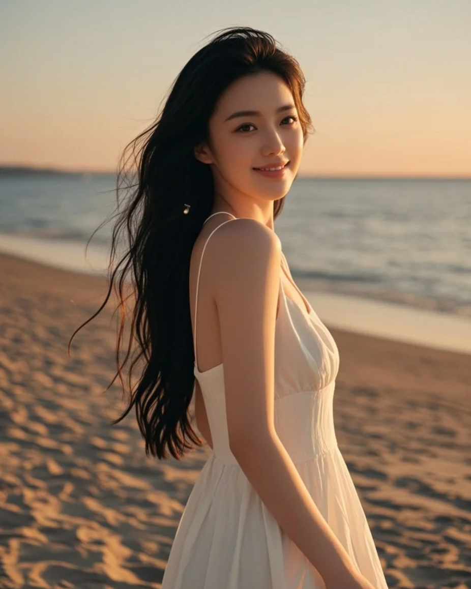 沙滩上的大明星,长发飘逸,笑容清新,姿态优雅动人