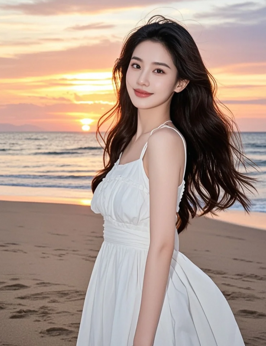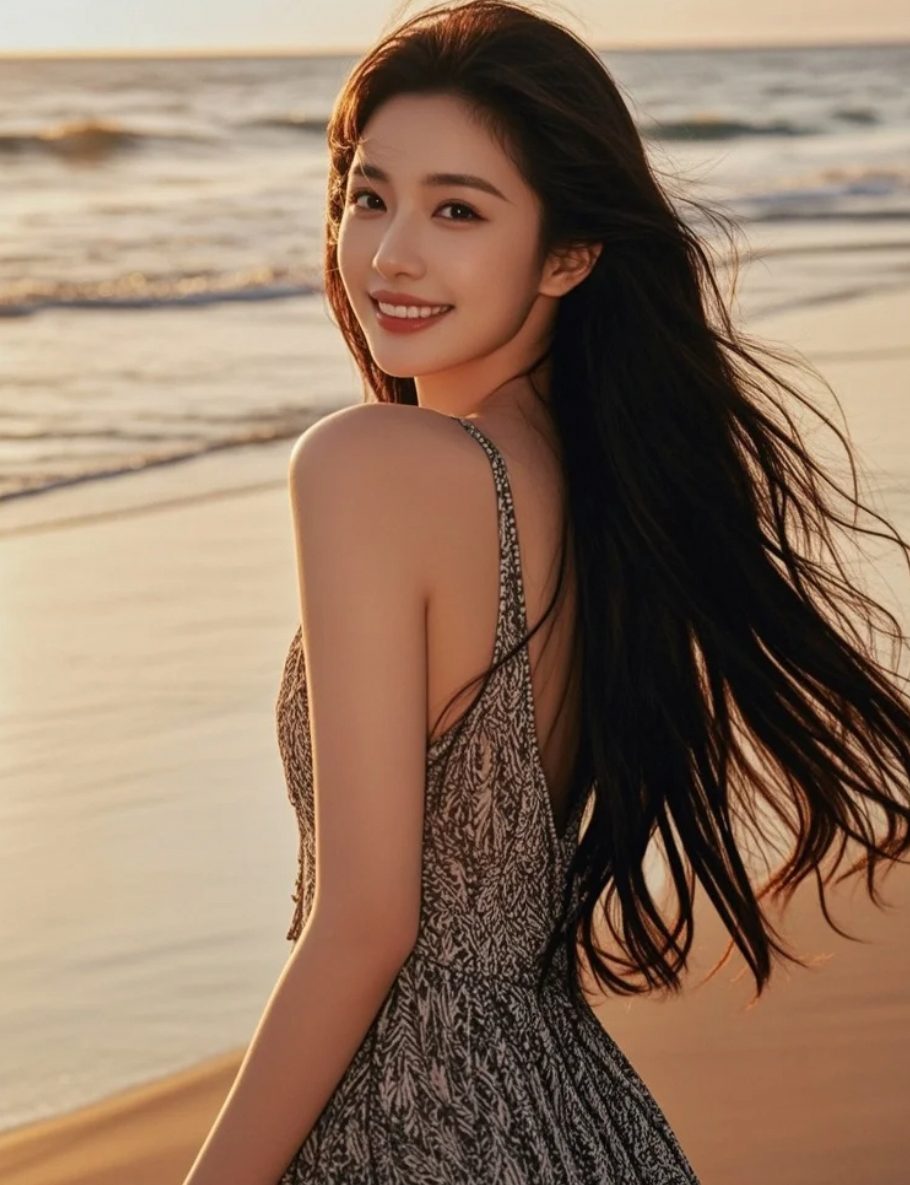 金色余晖中,长发女星优雅转身,笑容温柔,意境悠长