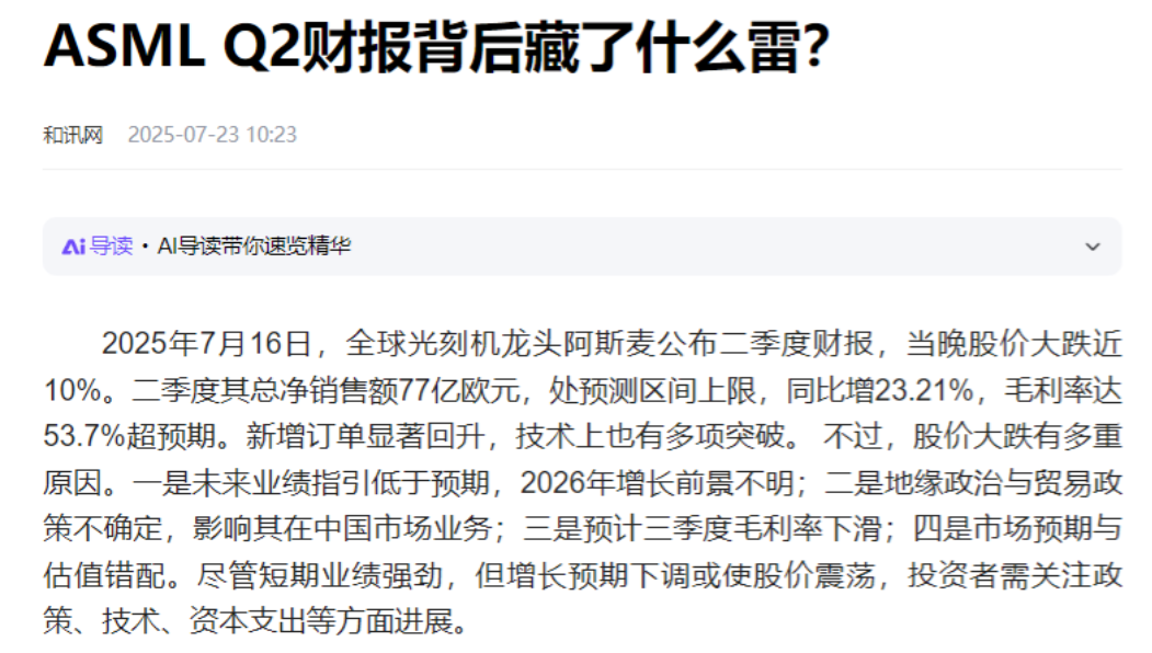 中国取消2550亿订单,光刻机已经“停工”,美国芯片公司开始着急:芯片还能卖给谁? 最近这段时间,各大公司都在晒第二季度的业绩报表,而荷兰ASML的报表刚一出来,股价直接跌了快10%,这可不是什么小波动,说到底还是咱们这边不怎么买进口芯片造成的。 以前咱们不少芯片都得从国外买,美国芯片公司靠着这生意赚得盆满钵满,可现在不一样了,咱们自己研发的芯片越来越多,很多原本要进口的订单,都换成了国产芯片。 ASML造的光刻机就是用来生产芯片的,中国订单少了,他们的机器自然就没那么多活干,股价下跌也就在情理之中。而且咱们的芯片研发进度,还在一个劲儿往前赶。 7月23号的时候,中国新研发出了一种“存算一体”芯片,这种芯片处理数据的时候比以前的更高效;不光这个,其他公司的AI芯片也接二连三地亮相,不管是日常用的手机、电脑这些电子设备,还是需要高端芯片的人工智能领域,咱们都有了自己能拿得出手的产品。 到了8月,更关键的事儿来了——中国自己研发的商用光刻机也成功了。 要知道,以前造芯片的核心设备就是光刻机,咱们很大程度上得依赖进口,美国还总想着用这个卡咱们的脖子,不让先进的设备进来。现在咱们自己能造光刻机了,意味着从生产芯片的设备到芯片成品,咱们都能自己搞,对进口芯片和设备的依赖越来越小。 这一下,美国芯片公司彻底慌了,以前中国是他们最大的客户之一,订单量一大把,现在中国买得少了,其他国家要么有自己的芯片产业,要么也开始考虑性价比更高的国产芯片,他们手里的芯片一下子就没了好销路。 其实美国芯片公司落到今天这步,也怨不得别人。以前他们仗着技术优势,动不动就对其他国家搞技术封锁,想着一直垄断市场赚大钱,可他们没料到,中国会下这么大的力气搞自主研发,从芯片设计到生产设备,一步一个脚印突破技术难关。 现在咱们自己的芯片能满足越来越多的需求,小到家用电子设备,大到工业、科技领域,自然就不需要再大量买美国芯片了。反观美国芯片公司,失去了中国这个大市场,又找不到能替代的大客户,只能眼睁睁看着手里的芯片卖不出去,着急也是必然的。 往后要是他们还抱着垄断的想法不放,不学着跟其他国家好好合作,恐怕日子会越来越不好过喽。