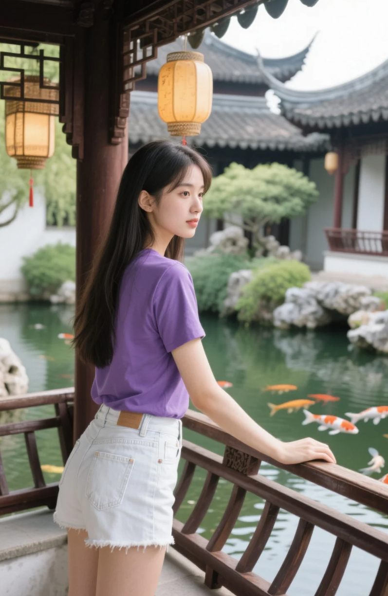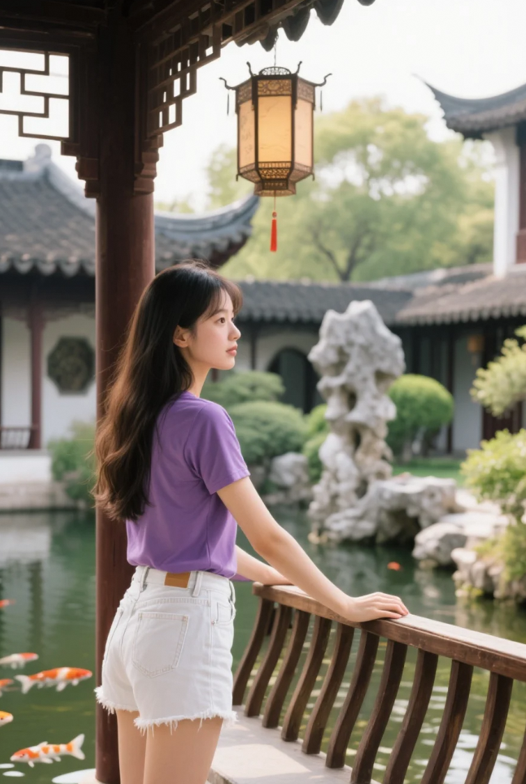假山叠影,藤蔓垂帘,她站在时光的缝隙里看鱼游