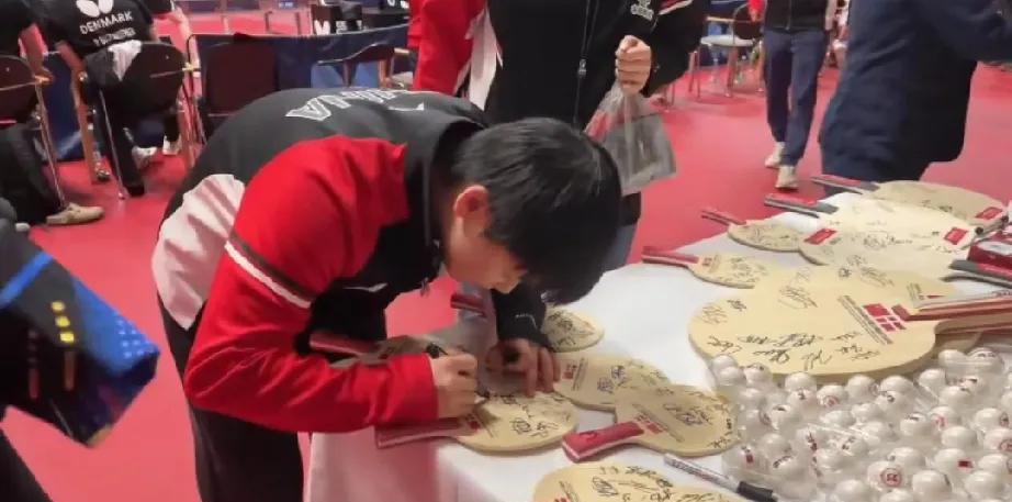 莎莎参加丹麦活动,签名签到手软! 丹麦的球迷都特别喜欢莎莎,都想要莎莎的签名,签名环节自然少不了。 不过这也太多了,大大小小的球拍摆满了一桌子,莎莎挨着签,工作量有点大哈,不过莎莎很认真,还怕漏了哪一个。 签完了可把孩子累坏了!腰都酸了吧!