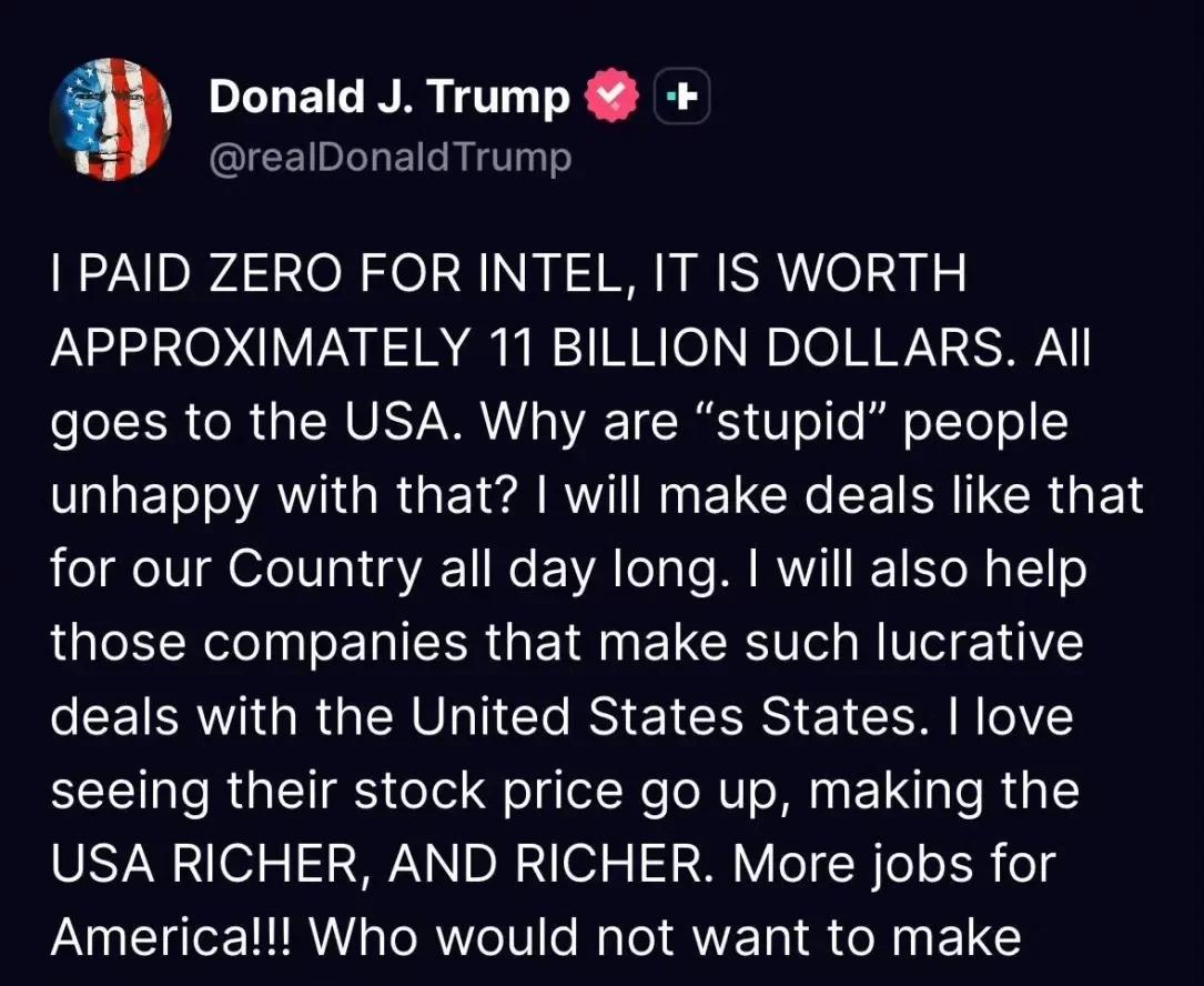 特朗普空手套白狼英特尔,引发美国各界担忧和愤怒,懂王也怒了: “我0成本就拿到了10%的 Intel,这笔交易价值大概 110 亿美金,全都进了美国的口袋。结果还有蠢人不满意? 我整天都愿意为美国做这种交易,那些能跟美国做这种赚钱交易的公司,我也会去帮他们。 我就喜欢看到他们股价往上涨,让美国越来越有钱!这还能创造更多美国就业!谁会不想要这样的交易呢?”