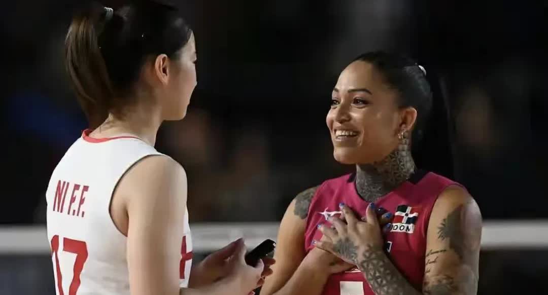 中国女排在世锦赛小组赛收官战3-0完胜多米尼加女排,将她们“推给”了巴西女排,赛后,两队队员亲切交流,气氛融洽,倪非凡与多米尼加队的世界著名自由人卡斯蒂略打招呼,王媛媛与曾在天津打球的前队友塔皮亚合影留念。
