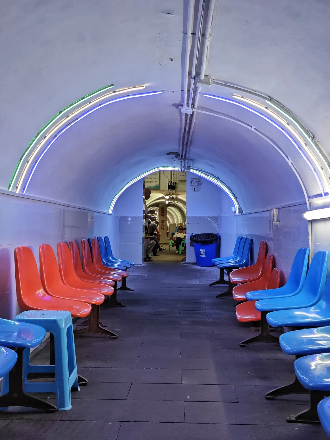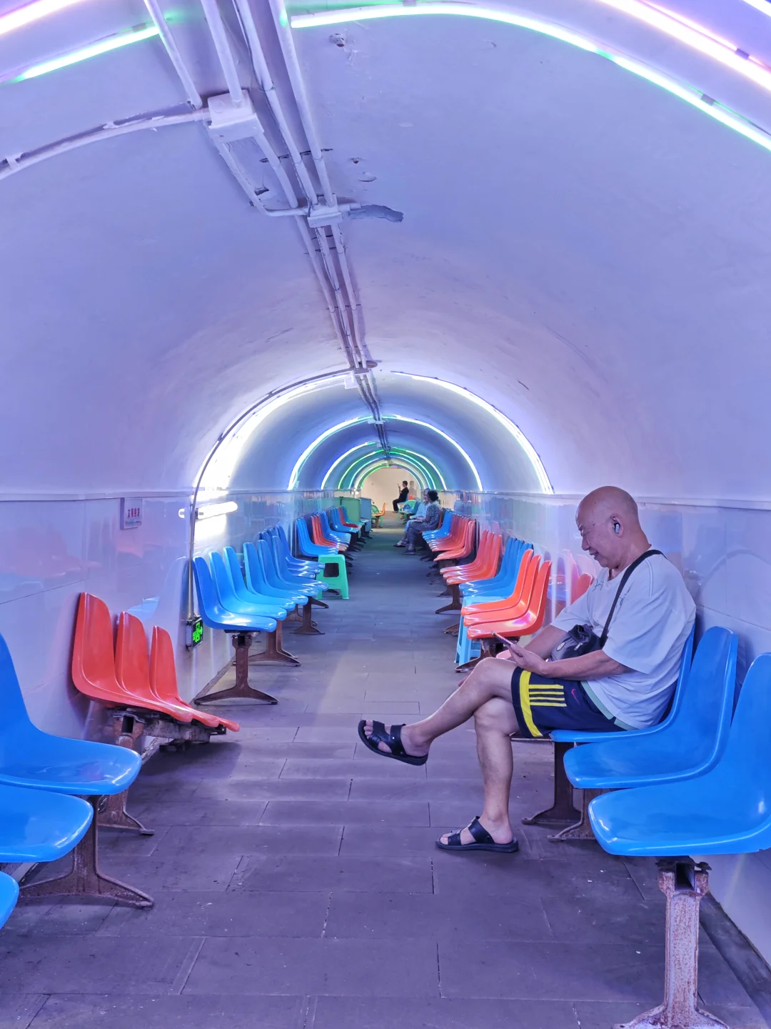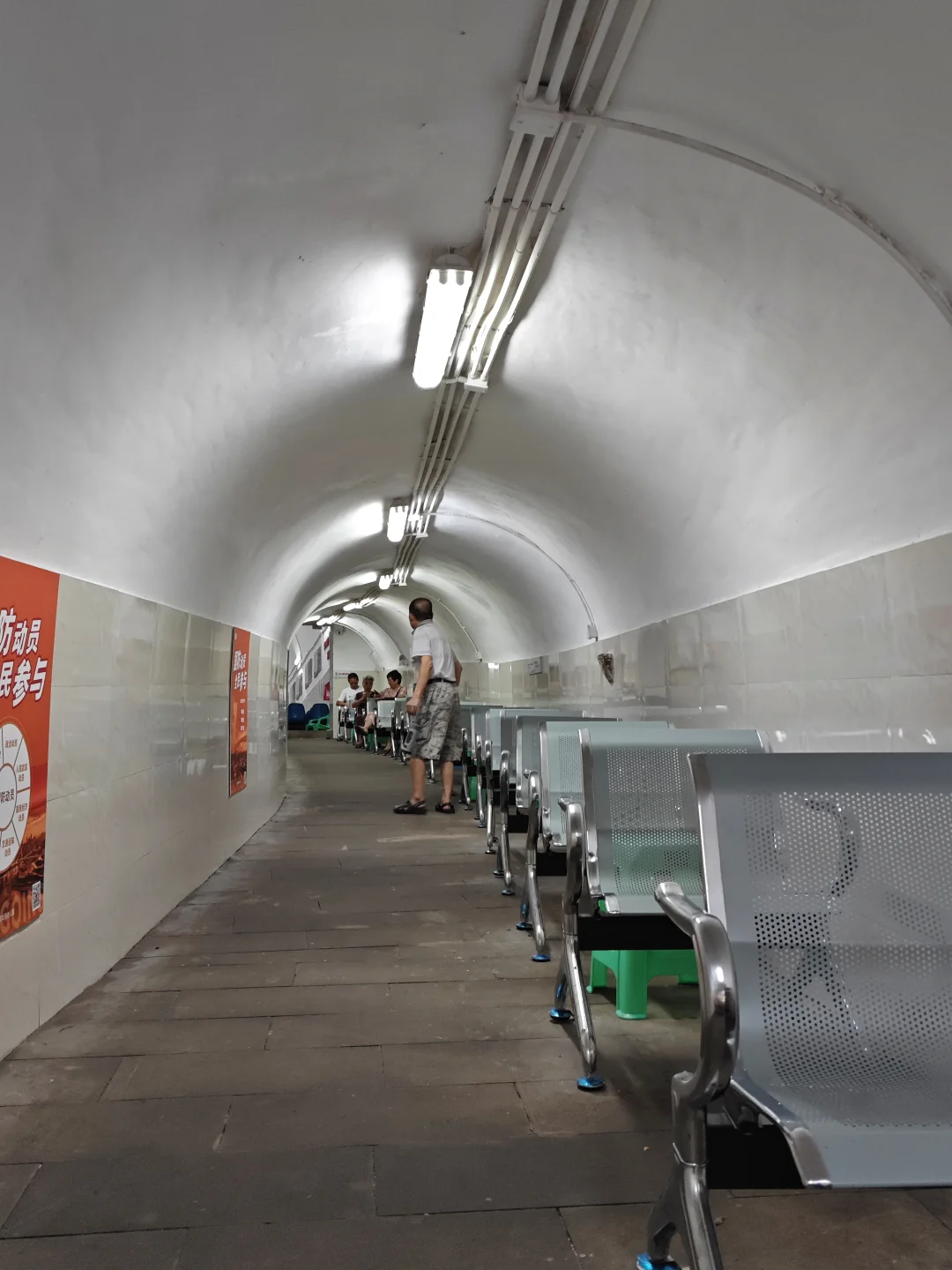 前面发过一些开放的防空洞纳凉点,我觉得比轻轨站要好。首先有座位,而且很多,不像轻轨站板凳少,很多坐地上。其次有电,可以充电,还有免费的直饮水,这是轻轨站不具备的。配置好一点的防空洞还有厕所以及电视,书刊,老年人带着小朋友完全可以在里面待上一下午。这次去的是石井坡街道某个大型防空洞纳凉点。