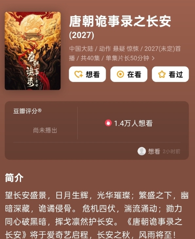 第三季《唐朝诡事录之长安》已经完成配音工作,有望11月份播出,这部剧还有第四季《唐朝诡事录之蜀道》,已经有很多年没见过拍很多季的电视剧,且每一季的口碑和播放数据都很不错的电视剧了。第一季38万人给了豆瓣8分,第二季29万人给了豆瓣8.6分,第二部比第一部口碑还好的剧非常罕见。
