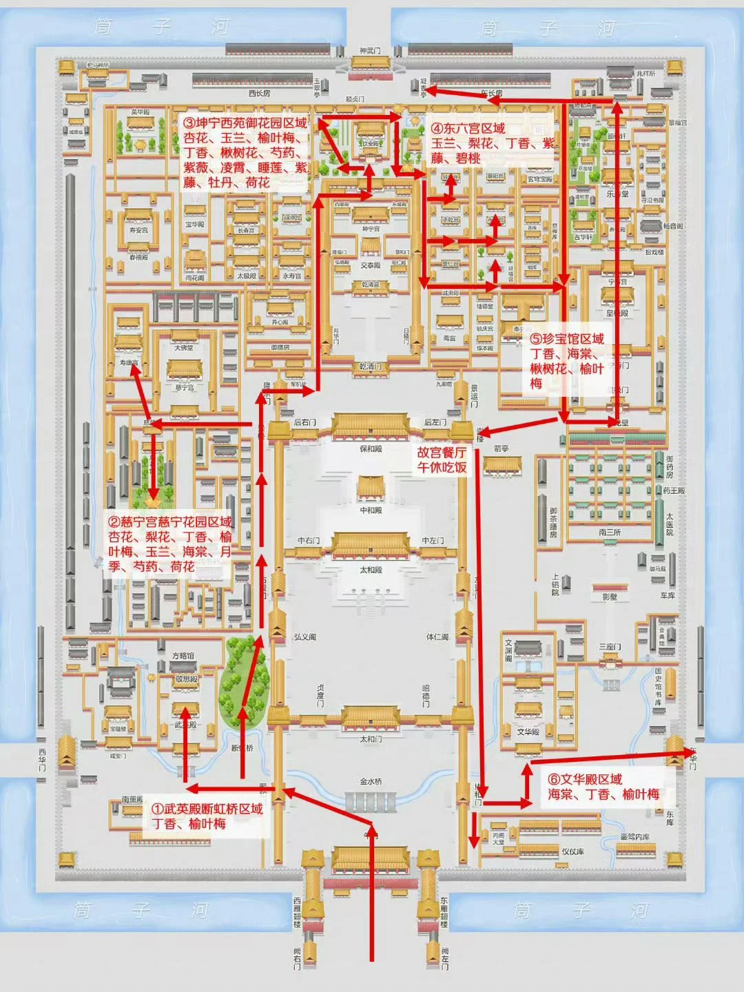 大家好,我是默存 , 一个致力于给世界带来美好的摄影爱好者。 今天给大家带来的是故宫春季赏花攻略。 我之前把故宫的花按照季节和宫殿具体位置来分,现在想可能过于繁复,为了故宫新手友好的入门,我这次只把故宫的花花分为6大赏花区域,只要你3-6月去这6个地方,就能看到不一样的花。🌸 1️⃣武英殿断虹桥区域 2月-3月腊梅(右翼门外) 4月初丁香、榆叶梅 6月石榴 2️⃣慈宁宫慈宁花园区域 3月下旬杏花 4月初梨花、丁香、榆叶梅 4月上中旬海棠 5月月季、芍药 6月荷花、凌霄、睡莲 3️⃣坤宁西苑御花园区域 3月下旬杏花 3月底玉兰 4月初梨花、丁香、榆叶梅 4月底5月初紫藤 5月楸树花、芍药、月季 6月荷花、睡莲 7月下旬-8月初紫薇 4️⃣东六宫区域 3月底玉兰、杏花 4月初丁香、梨花 4月中旬碧桃(东厂房) 4月底5月初紫藤 5️⃣珍宝馆区域 4月初丁香、榆叶梅、海棠 5月楸树花 6️⃣文华殿区域 4月初丁香、榆叶梅 4月上中旬海棠