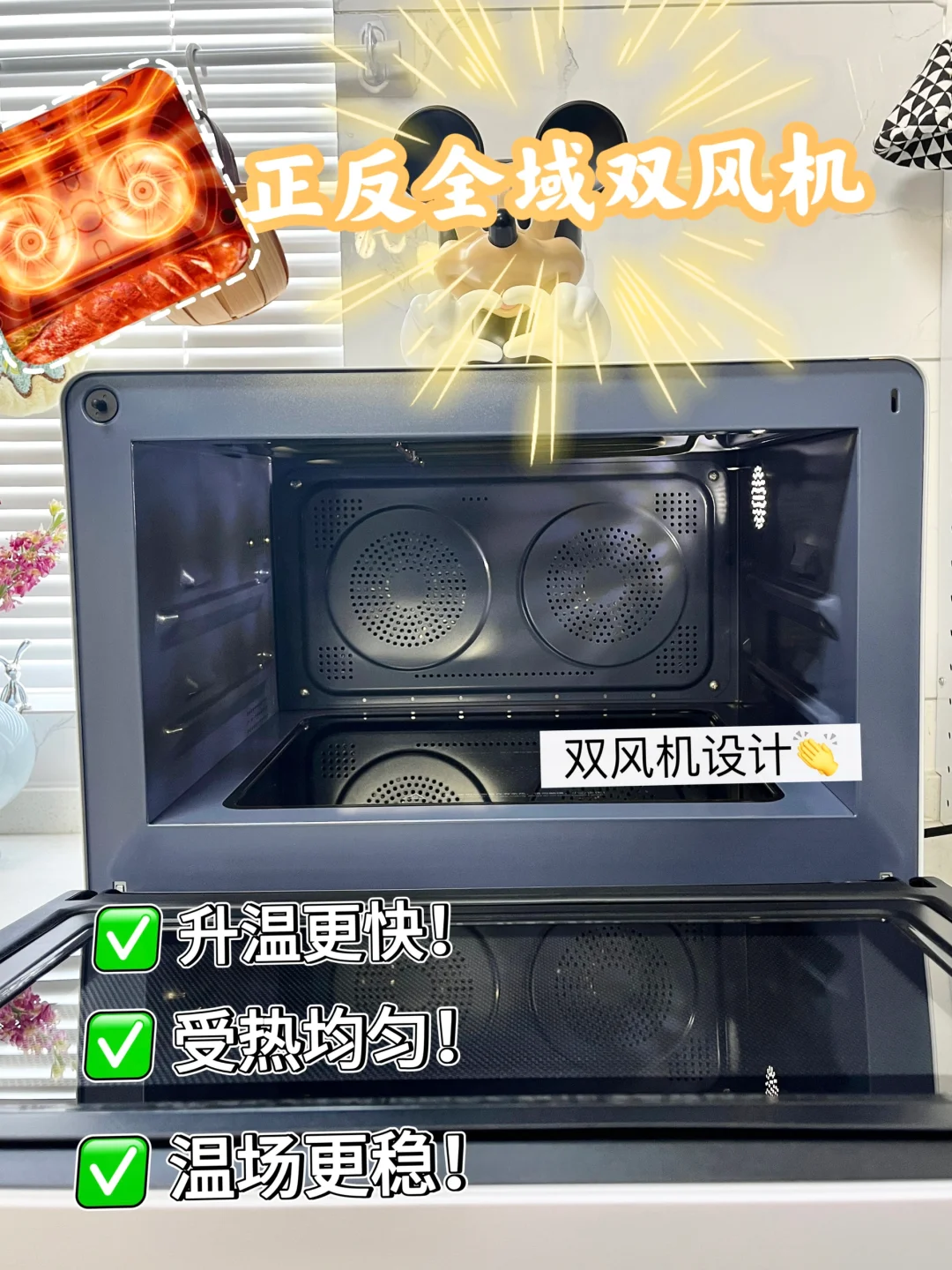 相比于市面上专业的微蒸烤,它双风机搭配上下背部烤管,那是相当的🐮!能让食材升温快、温场稳定、上色更加均匀!上下管还能独立控温,烤出来鸡翅外酥里嫩嘎嘎好吃![派对R]