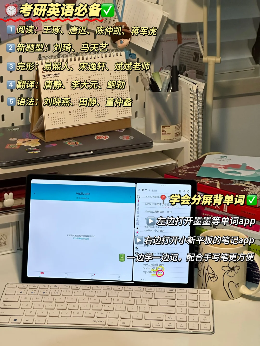 ③用分屏方法背单词:小新平板左边打开单词app,右边分屏记笔记,配合手写笔和键盘更好用。这种学习方式更接近高中集中刷题学习模式,让我们注意力高度集中,效率更高