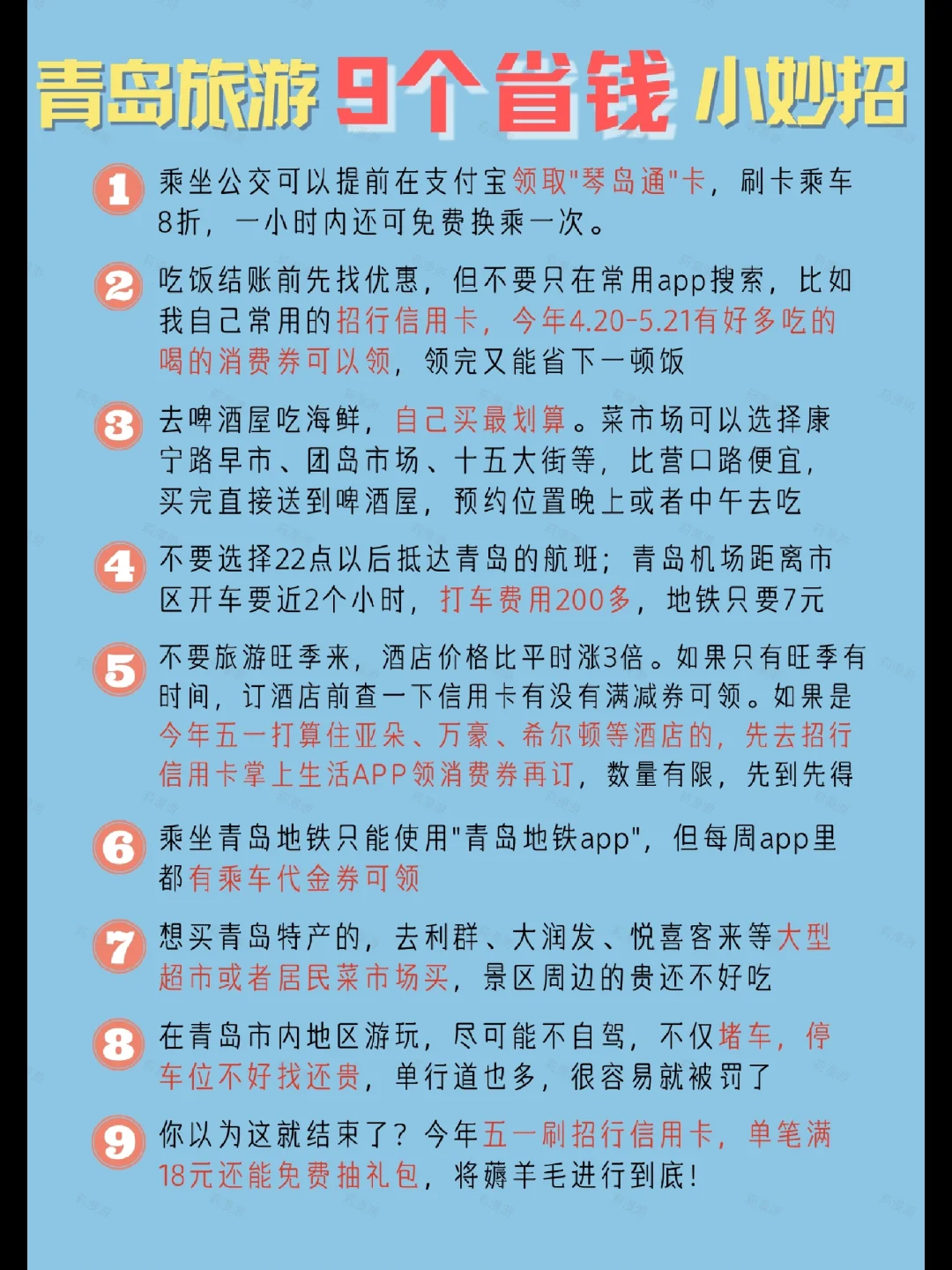 青岛,这个肥腴生猛的海鲜之都,也是我从小吃到大的地方 尤其是扑簌扑簌掉进碗里的海鲜,N种烹饪方式,总能让胃开挂,再配上一杯杯扎啤🍻吃完只剩肆意快活了 🔹🔹🔹 这次我整理了2⃣️7⃣️种青岛美食✅全部亲测过㊙️还忍痛抛出部分有且仅有本地人吃的店‼️店无广,骗人睡不着觉 如果你正打算五一来青岛旅行尝尝煮海的烟火气,这里万食俱备🌟记得收藏 🔹🔹🔹 ⭕云集美食宝藏地 ✅夜市选择:台东夜市、李村夜市、吕家庄夜市 ✅本地人美食街:漳州二路周边、云霄路周边、西镇 ✅本地人逛的菜市场:康宁路早市、团岛市场、十五大街市场等🚨营口路的海鲜区基本是游客,但19点后买海鲜也只能在这,还要做好买海鲜排队的准备 🔹🔹🔹 🐙吃海鲜 📍勇斌啤酒吧📍大杰海鲜锅📍孙家酱蟹 🔹🔹🔹 🐙吃本地菜 📍丰顺烧烤家常菜📍有滋有味渔家小院📍粥全粥道 📍大闫家烧烤📍双合园水饺📍爸爸笑特色烤肉店 🔹🔹🔹 🐙吃本地特色 📍六顺禾小笼包📍劈柴院锅贴总店📍振兴烤肉 📍温州特色营养砂锅📍山东大包📍海萍馄饨 📍知遇餐厅📍晓梦戳子肉📍如意香辣鸡架📍万和春 📍一品鲜金枪鱼饺子馆📍鑫鑫奶奶炸串📍酥皮油炸糕 📍姥家春饼店📍湛山寺素香斋📍地二鱼汤馄饨 🔹🔹🔹 💰省钱小技巧 每到假期,评论区就有人和我吐槽青岛住宿贵,没错,尤其是今年五一💰价格=平日价x3⃣️,真的很夸张 但我最近订五一的酒店发现⭕招行信用卡的隐藏大羊毛 ✅从今天起到5.21,上掌上生活app可以领亚朵、锦江之星、万豪、希尔顿等酒店的消费券,省下来的钱还能再点一道海鲜! 还🈶奶茶、咖啡的券可以领,边喝边吃美滋滋‼️不过数量有限,要先到先得喔💰并且买完单还能再抽个消费券,住的开心吃的开心玩的也开心! 还有一些本地吃饭、交通的优惠,整理在图5,别漏看哦 🔹🔹🔹 每个地域都有自己的珍馐,或许青岛风味不算特别,但它们蕴藏着这片土地的人情味 你在青岛吃海鲜被坑过么? [PK]