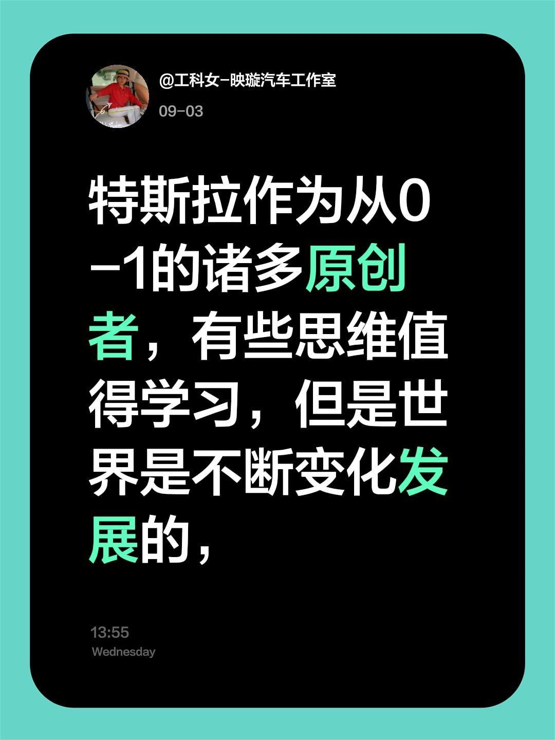 特斯拉现在的技术还领先吗?我评论了@工科女-映璇汽车工作室 的作品: 特斯拉作为从0-1的诸多原创者,有些思维值得学习,但是世界是不断变化发展的,
