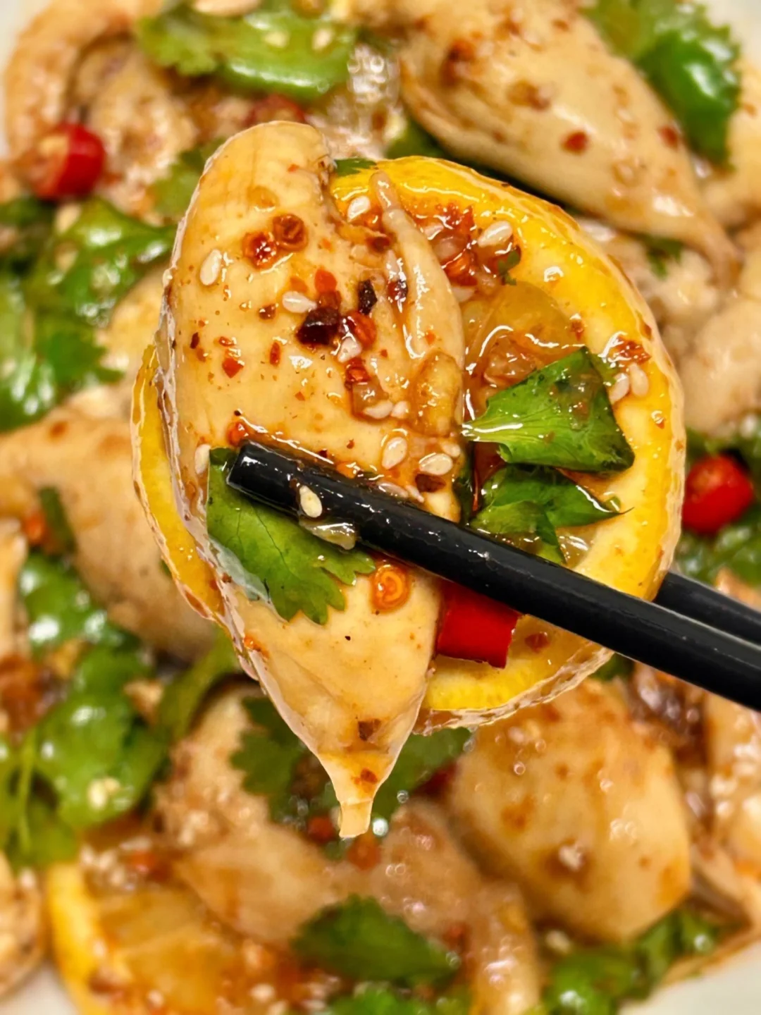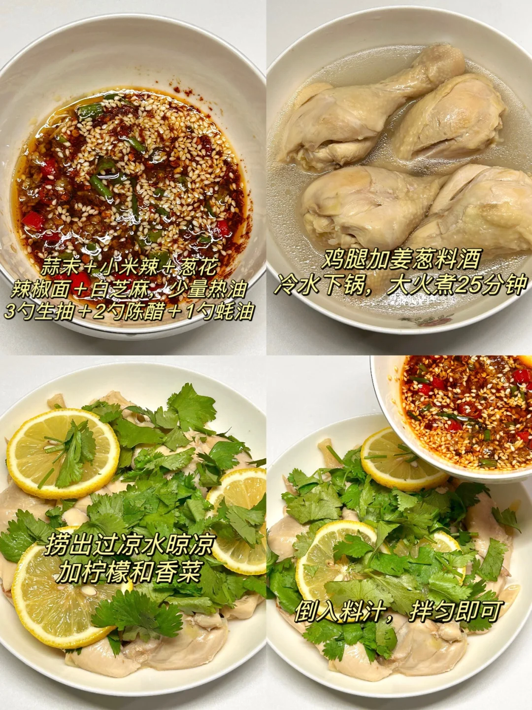 做法也很简单,调个料汁(配方看图示),鸡腿加姜葱料酒大火煮25分钟,捞出来加凉水晾一会,手撕成块,加柠檬和香菜,倒入料汁,拌匀就可以了。