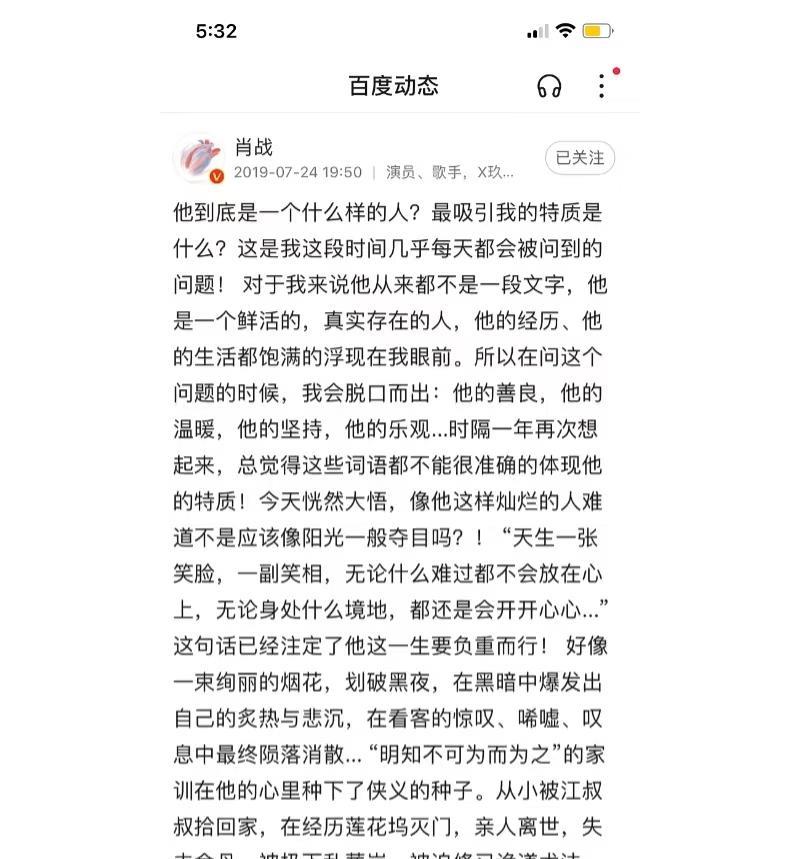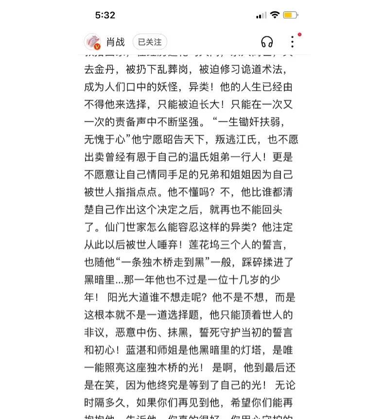 今天偶然间刷到了一个六年级的学生写肖战的题记【我的偶像肖战】,写的真的很好,短视频时代,我停下来,从头读到尾,心里软软的,这么小的孩子,说出了我说不出的道理!又翻到肖战以前写给阿羡的小作文,好感慨,已经六年了! 感觉从肖战19年的盛世到现在,内娱再没有一个人能火成这样爆成这样的。这么多年内娱再没第二个像肖战这种类型的男演员出现了。 他完全是那种,老了会被后辈考古,列入盘点男演员颜值排行榜的类型。 除了硬性条件外,相较于其他演员最突出的是心性优越一大截,荣辱不惊,不卑不亢,自尊自爱。并且心性成熟,脑子清醒,以解决问题为导向,不被情绪所主导和控制。执行力、判断力、决策力、学习主动性、投入度在演员这份职业上都表现得相当出色! 最让我佩服和感触的是他对演员这份职业是敬畏和渴望的,并且这么多年持续的高精力、高压力,对这份职业没有精神上的疲惫和厌倦。此外对自己这份职业的规划和原则都相当清晰,是一个对自我剖析很彻底的人。 在每部作品的访谈中,肖战总会反复提及“人物小传”的重要性。他通过撰写人物小传,主动填补剧本之外的角色时空,深入挖掘人物性格及其转变的完整脉络,从而实现对角色的整体性把握。 人物的筋骨和肌理不仅存在于剧本之中,更隐含在剧本文字之外,需要演员将人物进行连贯整合、梳理、想象、审视、判断,确立人物在每个阶段每个场景中的行为逻辑和性格特质,在不变的性格基础上找到变化的心理脉络。 这一过程需要投入大量心力,却是塑造鲜活人物不可或缺的步骤。许多演员的表演往往停留在表面,依赖夸张的表情和动作来诠释角色。除了演技尚有欠缺之外,更关键的是,他们缺乏对人物的系统性理解,知其然而不知其所以然,难以构建出既统一又富有变化的人物性格。 肖战为角色写的人物小传,研究人物成长环境,深度挖掘剧本外的东西。只有自己去理解人物,才能演绎出你心中的人物。 所以肖战饰演的每一个角色都能让观众共情,你能相信这个人物是真实存在的,是平行世界中的活人 。肖战说: 更希望大家通过角色认识他,他会很开心,你们是因为哪个角色喜欢上肖战的呢?