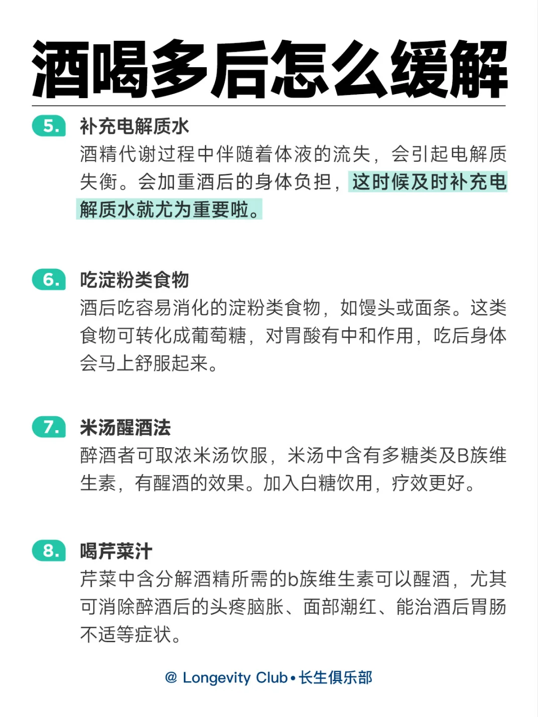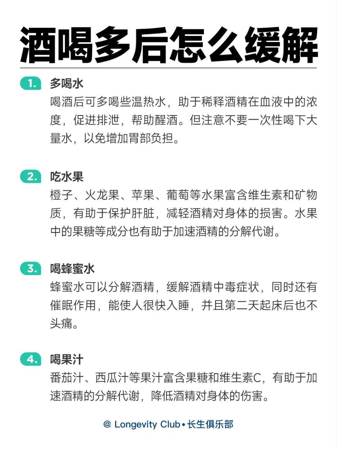 1.多喝水-喝酒后可多喝些温热水,助于稀释酒精在血液中的浓度,促进排泄,帮助醒酒。但注意不要一次性喝下大量水,以免增加胃部负担。