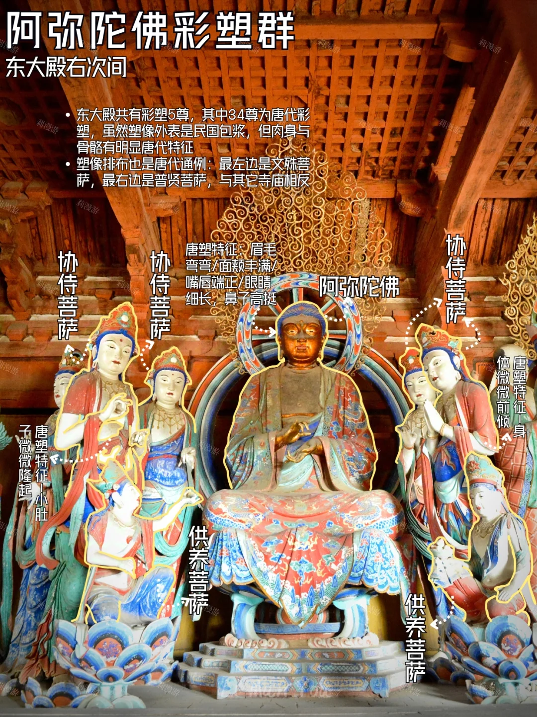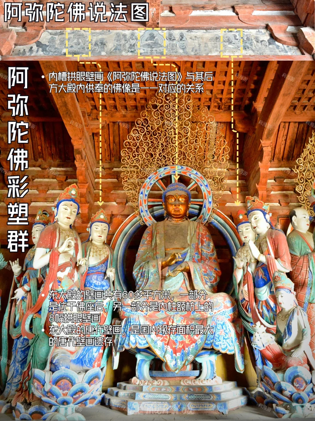 在东大殿右次间的拱眼壁上,你会看到一幅唐代壁画《阿弥陀佛说法图》,这幅壁画与内殿彩塑一一对应