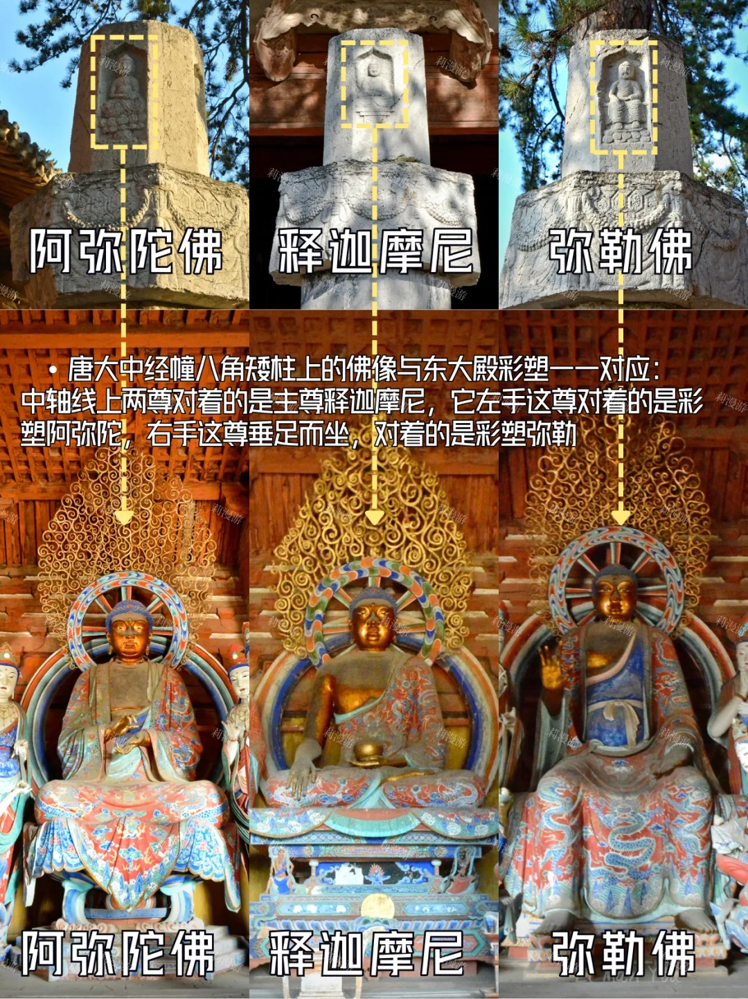 唐大中经幢八角矮柱刻的四尊佛像,中轴线上两尊对应殿内主尊释迦牟尼,左手对应殿内阿弥陀佛,右手垂足而坐的对应弥勒佛