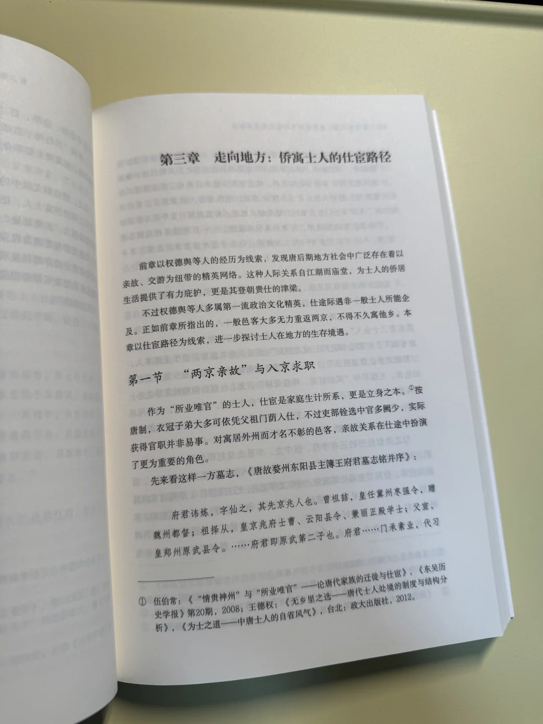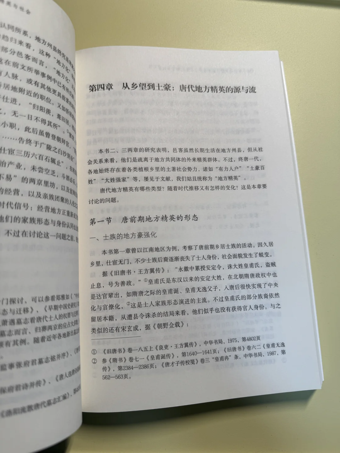 而唐宋之际,统治阶层的内部社会发生一次“换血”,出身庶族的官僚士大夫的崛起,逐步取代中古士族,称为士人阶层的主流形态。这些士人更专注于投身地方事业,比如文教、公共事业,兴建义庄,编修族谱等等。作者研究的就是这一转变是如何发生的。比如第一章探讨唐前期士人家族形态的变化,第五章考察地方精英与藩镇体制的关系,都很有意思。