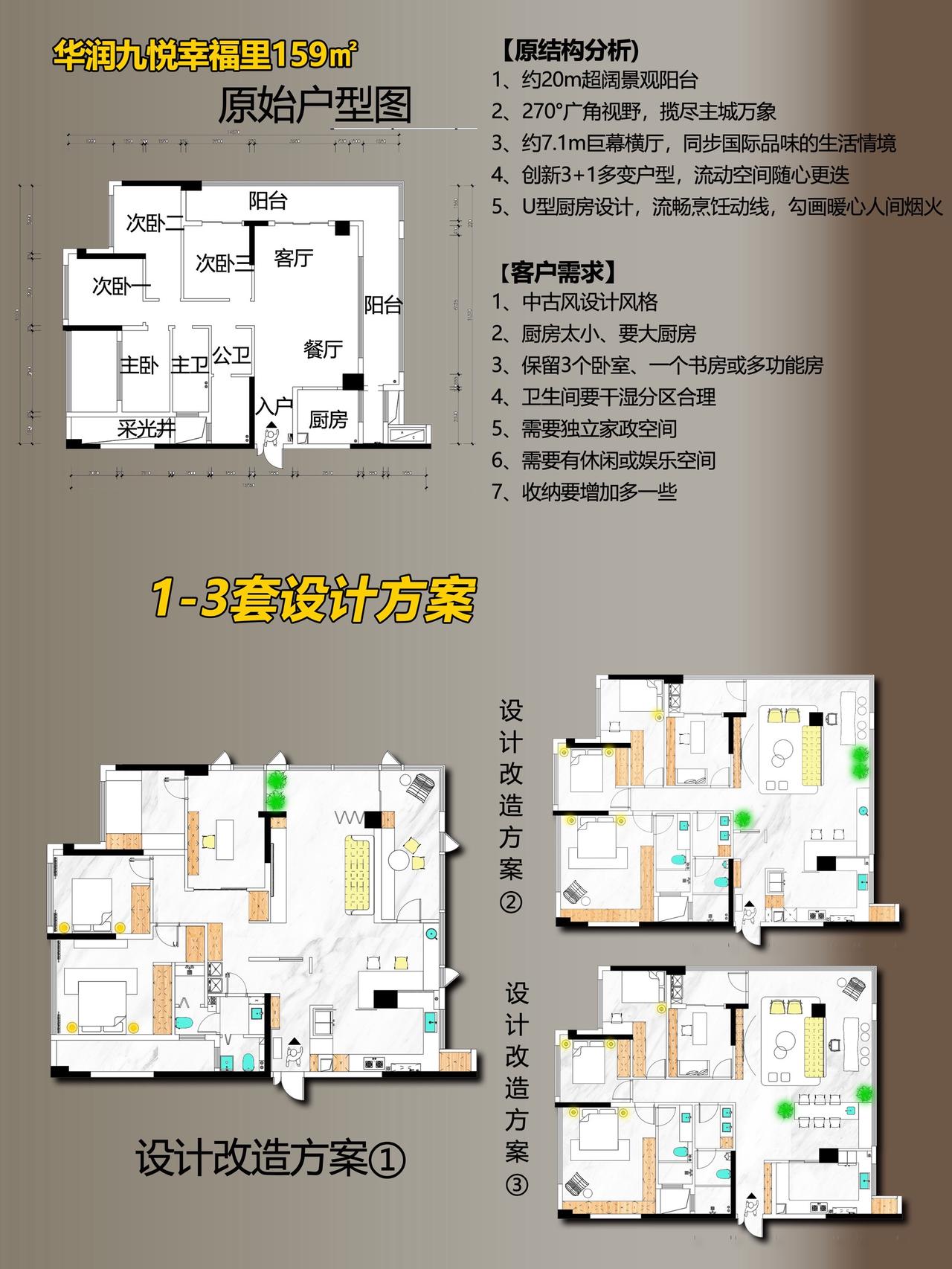 随着华润九悦幸福里新房交付,这段时间咨询我做设计的客户特别多,今天分享一套粉丝的新家设计✨同户型的客户想了解更多设计方案可以见一面沟通!✅ 👉【关于我】 一位充满热情、细心、靠谱的90后设计师。拥有别墅、洋房、跃层、大平层、普通住宅10年设计经验。为装修设计发愁的你排忧解难! 项目信息📋 📍楼盘:华润九悦幸福里 🏠户型:大平层 📏面积:159㎡ 🎨风格:中古风格 🏠【原结构分析】 1、约20m超阔景观阳台 2、270°广角视野,揽尽主城万象 3、约7.1m巨幕横厅,同步国际品味的生活情境 4、创新3+1多变户型,流动空间随心更迭 5、U型厨房设计,流畅烹饪动线,勾画暖心人间烟火 📝【客户需求】 1、中古风设计风格 2、厨房太小、要大厨房 3、保留3个卧室、一个书房或多功能房 4、卫生间要干湿分区合理 5、需要独立家政空间 6、需要有休闲或娱乐空间 7、收纳要增加多一些 【设计亮点】✨ 方案1️⃣:入户门厅过道做了环形动线,也起到屏风作用,卫生间合二为一,里面增加家政区,厨房扩大至生活阳台,可开放🉑封闭,餐厅西厨岛台餐桌,景观阳台布置休闲空间。 方案2️⃣:入户玄关做了屏风,保留双卫,公卫拥有双台盆和小便抖,主卧扩大至采光井,作出L型衣帽间,左上角儿童房还增加了学习功能,书房及多功能一体,家里来客还有沙发床🉑睡眠,阳台增加家政区,厨房扩大至生活阳台,可开放🉑封闭,餐厅西厨岛台餐桌,景观阳台布置品茗区。 方案3️⃣:厨房扩大至生活阳台,面积加倍,餐厅保留6人位岛台餐桌,客厅开放式,沙发品茗相结合。保留双卫,公卫拥有双台盆和小便抖,主卧扩大至采光井,作出L型衣帽间,左上角儿童房还增加了学习功能,书房及多功能一体,🉑办公🉑睡眠,阳台做家政区。 📄【个人案例】 中铁阅花溪|中铁逸都|中铁阅山湖|阅山湖云著|华润悦府|中海映山湖|茅台广场|美的林城|金融城|融创九樾府|中海印龙泉|华润九悦|龙湖天曜|龙湖湖山原著|万科鸣翠|万科麓山|铁建城|龙湖舜山府|远大美域|观山小区|建发和玺|保利公园 … 贵阳装修 华润九悦 华润九悦幸福里 全案设计
