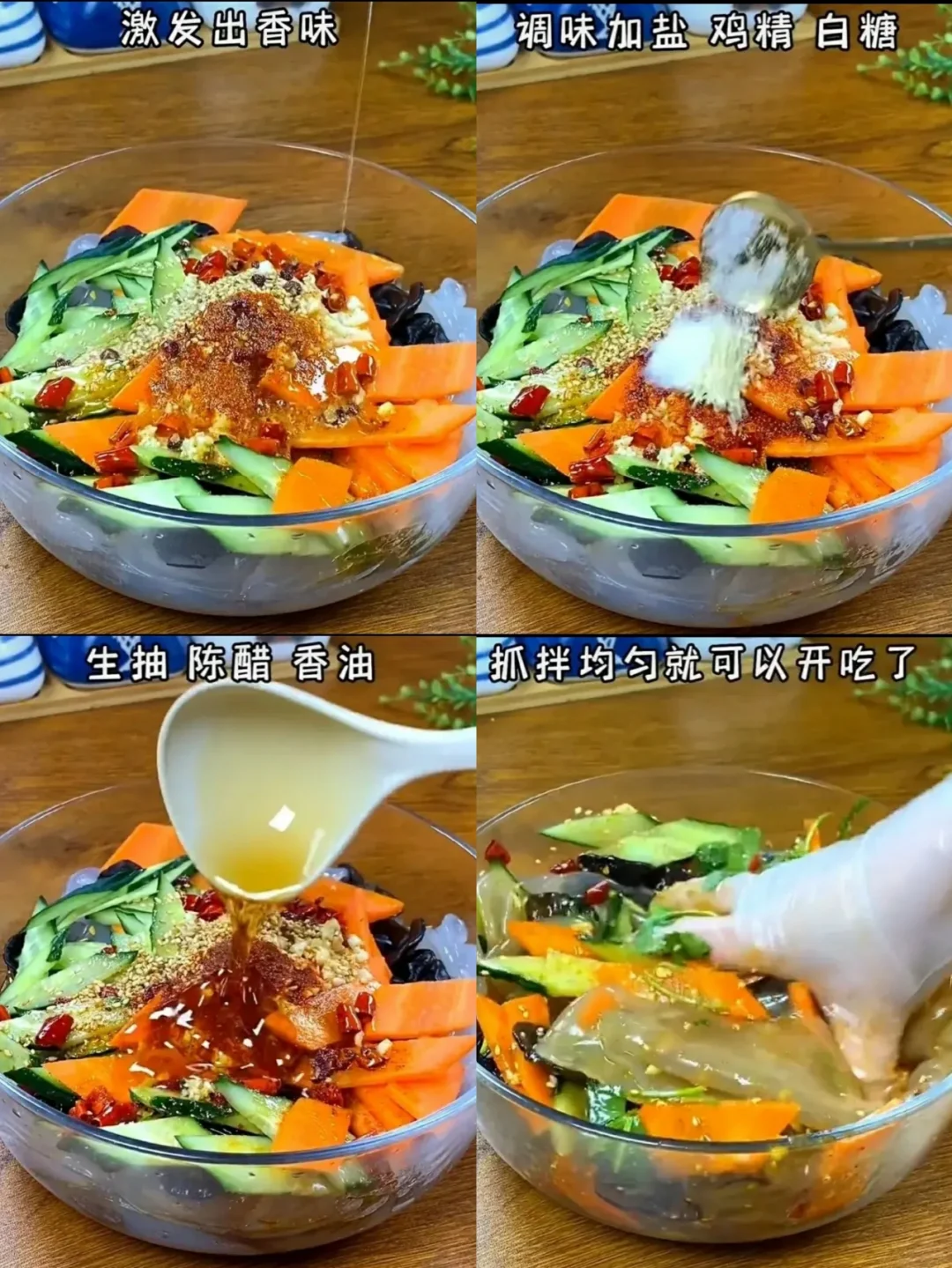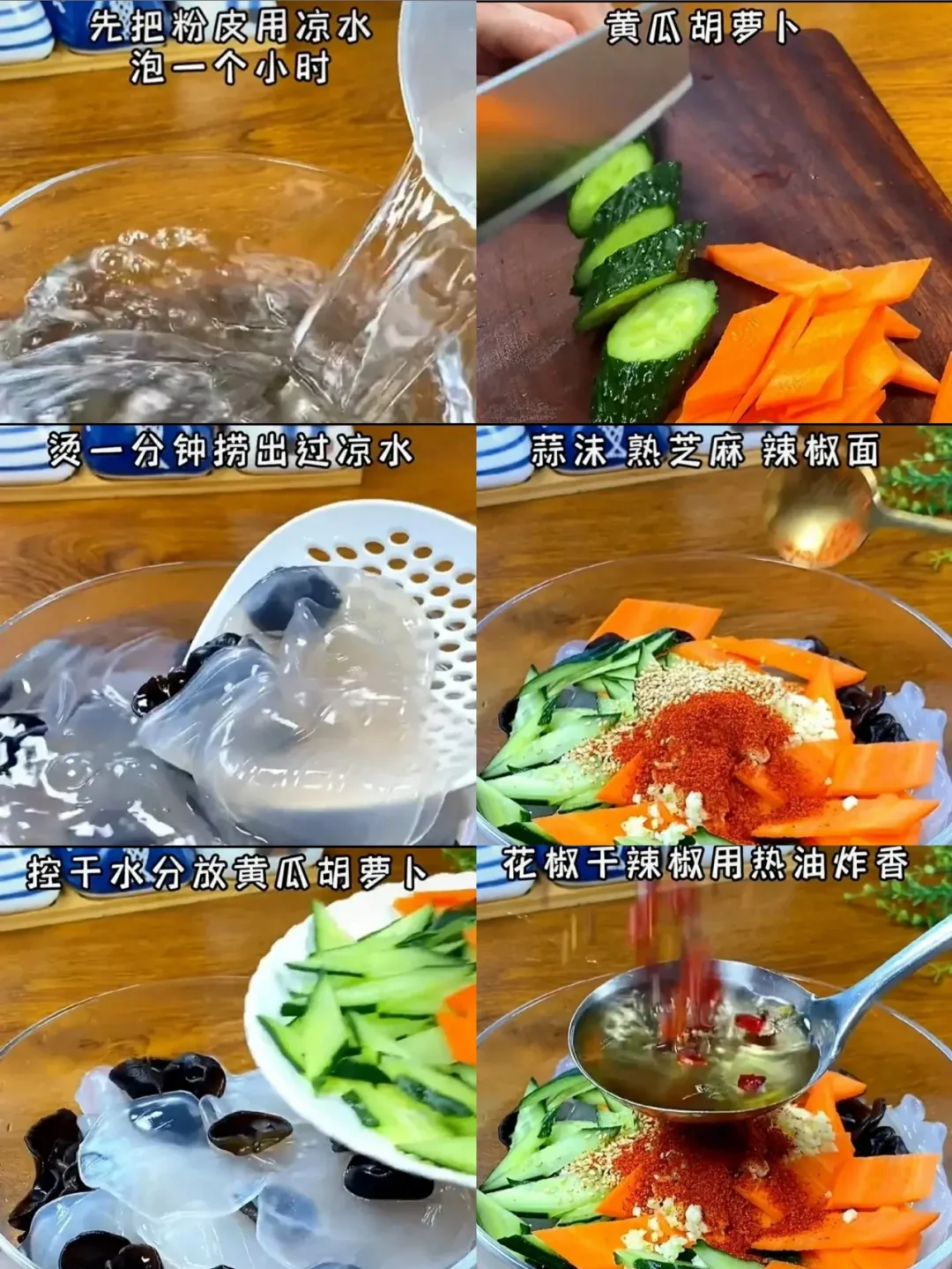 🙌做法 1⃣小粉皮用凉水泡一个小时,木耳也提前泡上,黄瓜跟胡萝卜切成菱形片备用。 2⃣起锅烧水,水开了下入胡萝卜,粉皮、木耳,焯水一分钟,捞出来过一下凉开水,再控干水份。 3⃣把黄瓜、胡萝卜跟木耳粉皮放在一起,加蒜末、熟芝麻、辣椒面。把花椒、干辣椒用热油炸香浇在碗中的辣椒面上。 4⃣最后加盐、鸡精、白糖、生抽、陈醋、香油调味,再来点香菜,抓拌均匀就可以开吃了,爽口开胃,还解油腻,大人小孩都喜欢[色色R]