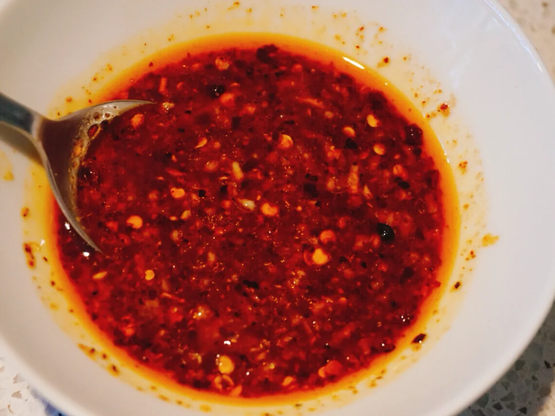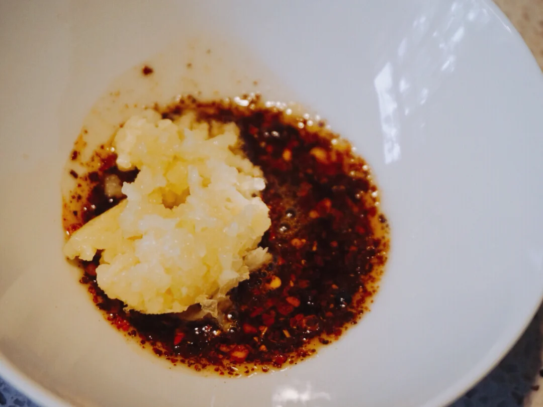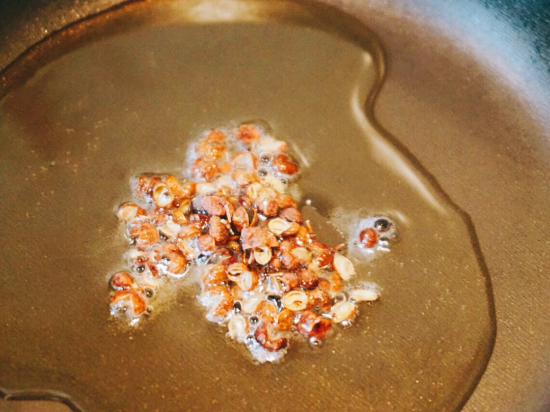 3⃣️小火煸炒花椒油,将煸香的油倒入辣椒粉中🌶️再放入蒜泥搅拌