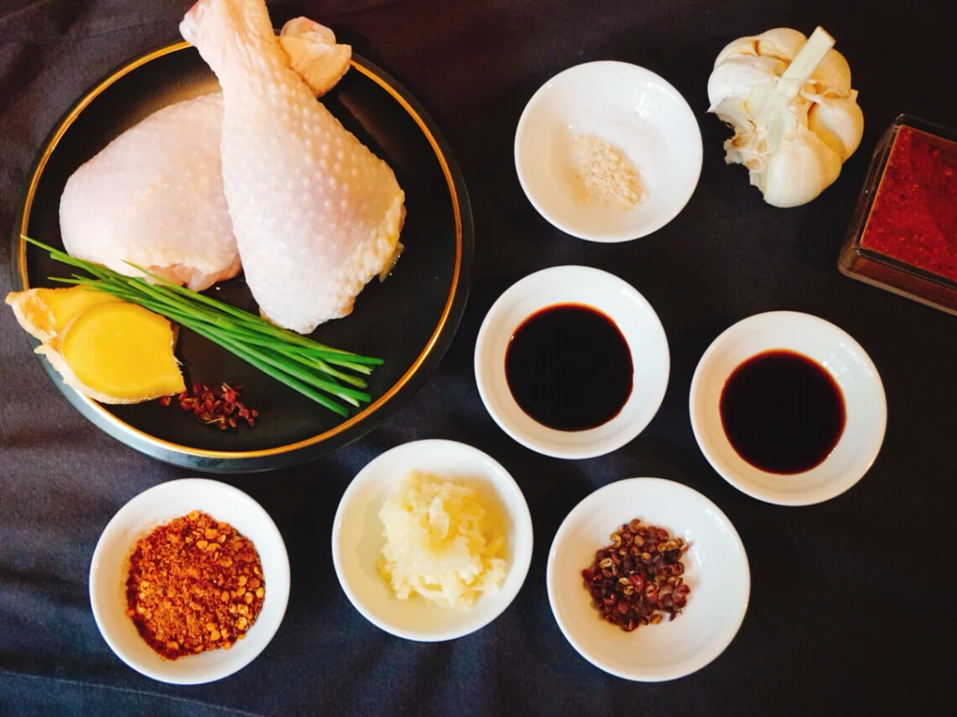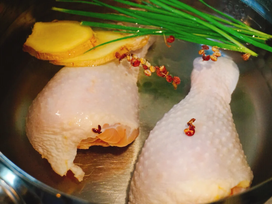 1⃣️将鸡腿,姜片,葱段,适量花椒粒冷水入锅,煮开后5分钟关火,焖15分钟后捞出🎐