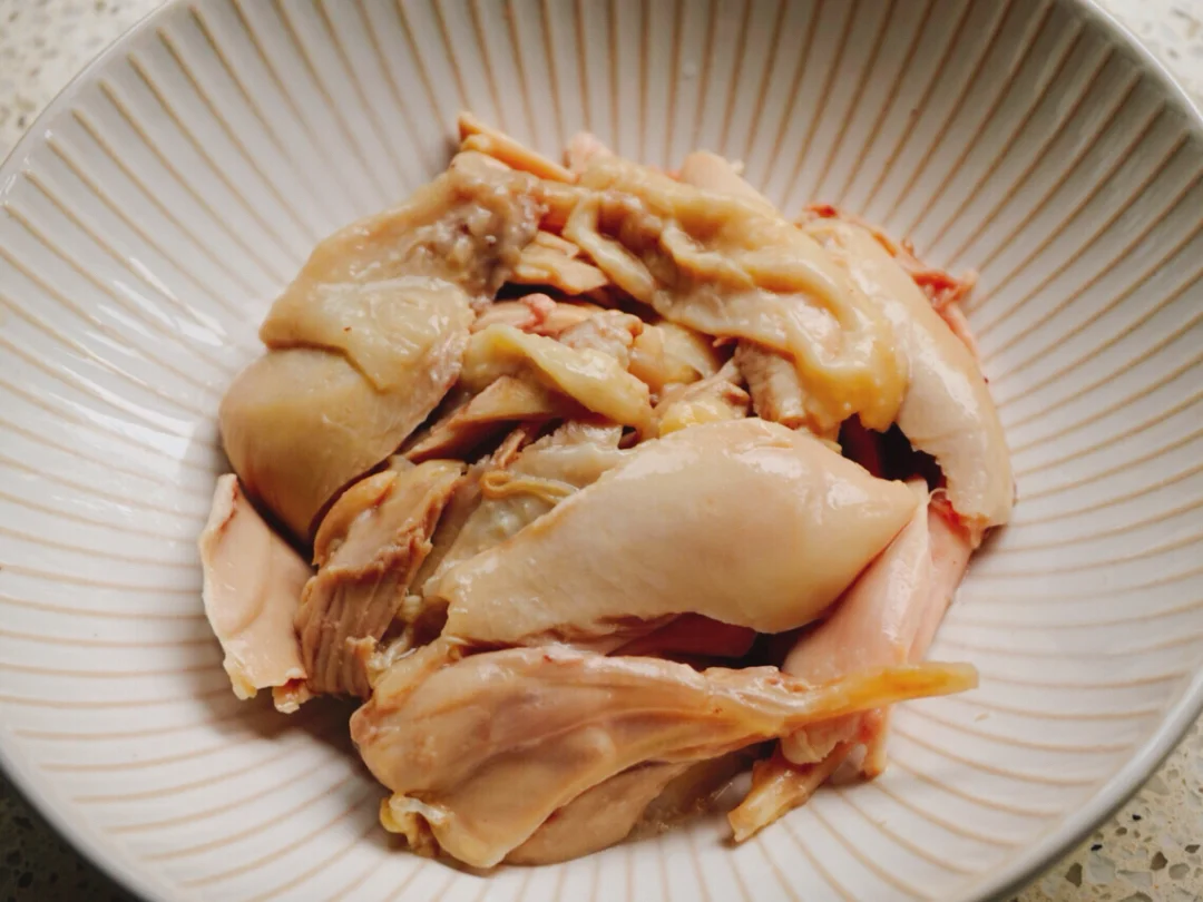 2⃣️将鸡腿肉撕成小块放入碗中