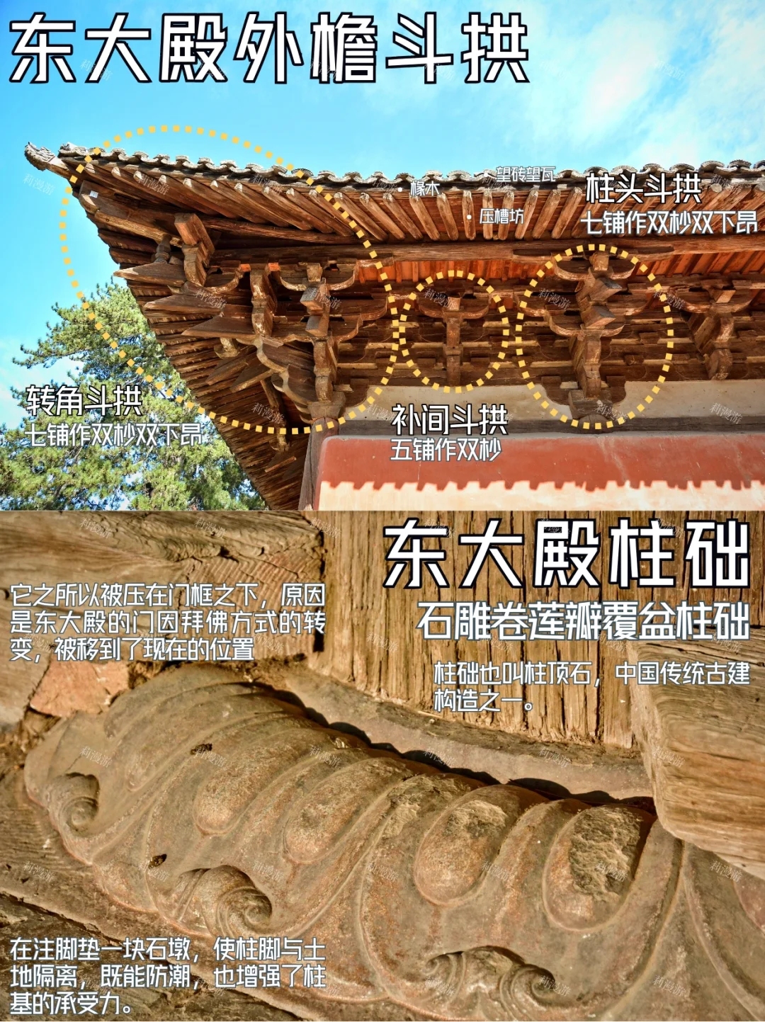 图4⃣️~8⃣️:东大殿唐代构建——硕大的斗拱、出檐深远的屋檐、精美的柱础、弯弯的月梁、密密的平闇……每一处都藏有工匠的巧思