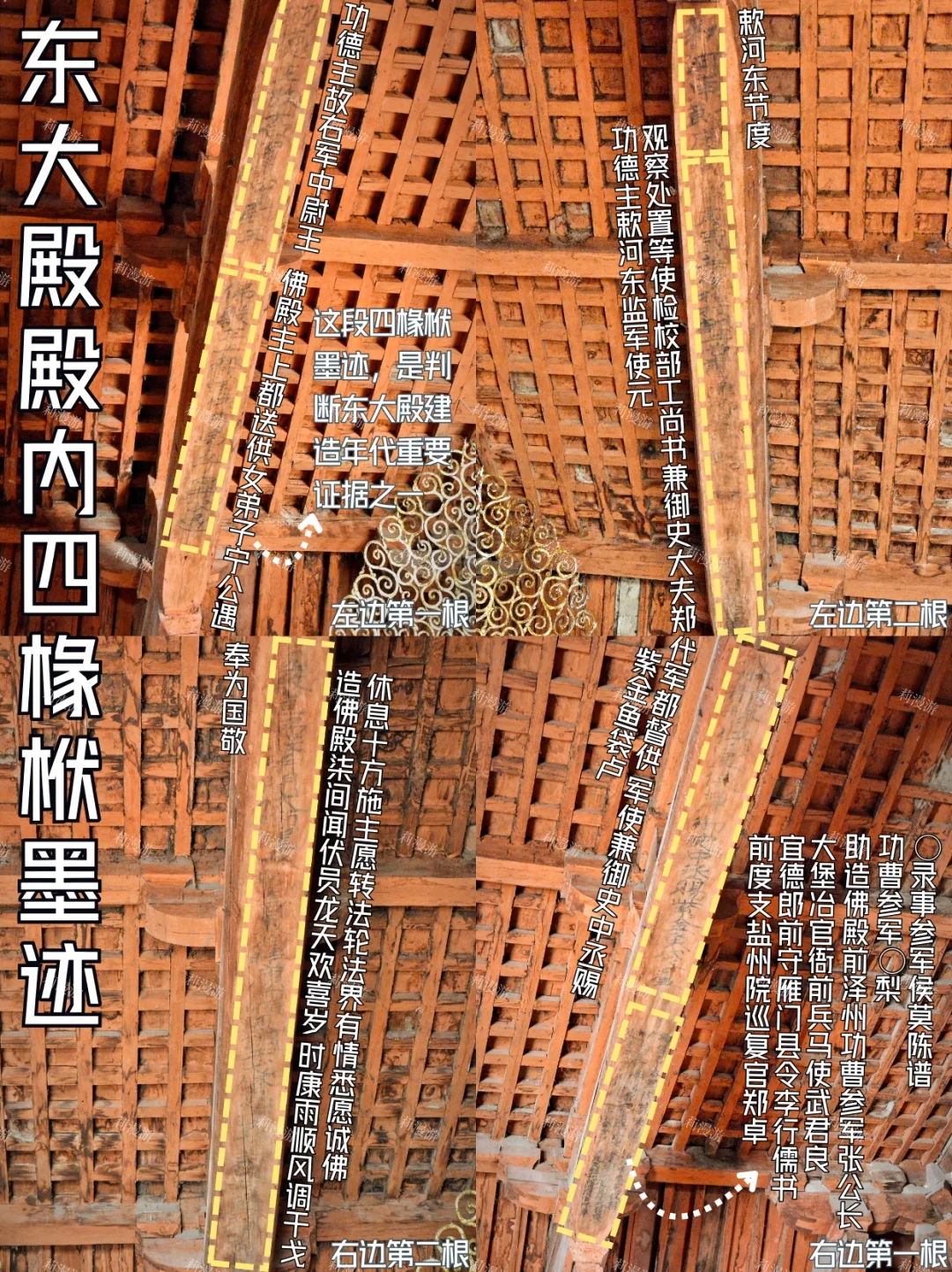 图3⃣️:东大殿梁架墨迹——梁下那段“佛殿主上都送供女弟子宁公遇“的题记,说是它断代的铁证