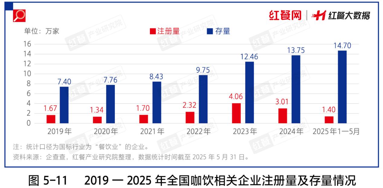 随着咖啡饮用场景的不断拓展和咖啡文化的加速普及,我国消费者的咖啡消费习惯逐渐被培养起来。消费端的快速扩容直接带动了咖饮赛道的高速增长。 《中国餐饮发展报告2025》数据显示,2024年全国咖饮市场规模达到了1,177亿元,同比增长15.4%。整体上看,咖饮品类仍有较大的发展空间,2025年其市场规模预计逼近1,300亿元。 随着咖饮市场进入更深层次的竞争阶段,咖饮品类的入场门槛逐步提升,创业热度有所降温。《中国餐饮发展报告2025》数据显示,2024年全国咖饮相关企业注册量为3.01万家,同比下降25.9%;2025年1月至5月,全国咖饮相关企业注册量为1.4万家,咖饮相关企业存量为14.7万家,仍保持同比增长态势。 在门店数方面,全国咖饮门店呈净增长态势,但扩张速度明显放缓。具体到品牌,扩张速度分化显著。头部品牌持续领跑,中腰部品牌等扩张放缓。 同时,部分老牌及中小咖饮品牌因产品创新、运营效率等竞争力不足,门店数出现收缩。行业集中化趋势凸显,截至2025年5月,全国咖饮品牌门店数CR3达16.7%,较2024年6月提升1.9个百分点,“强者恒强”格局显现,头部品牌有望进一步拉开差距,马太效应加速。 中国餐饮发展报告2025