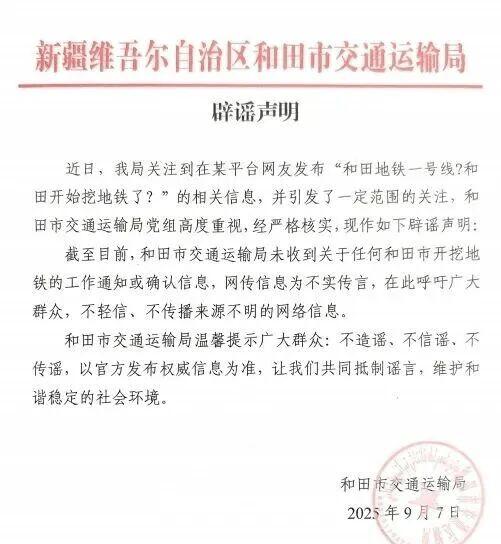 新疆和田开始挖地铁?谣言! 近日,有网民在某平台发布内容称:“和田地铁一号线?和