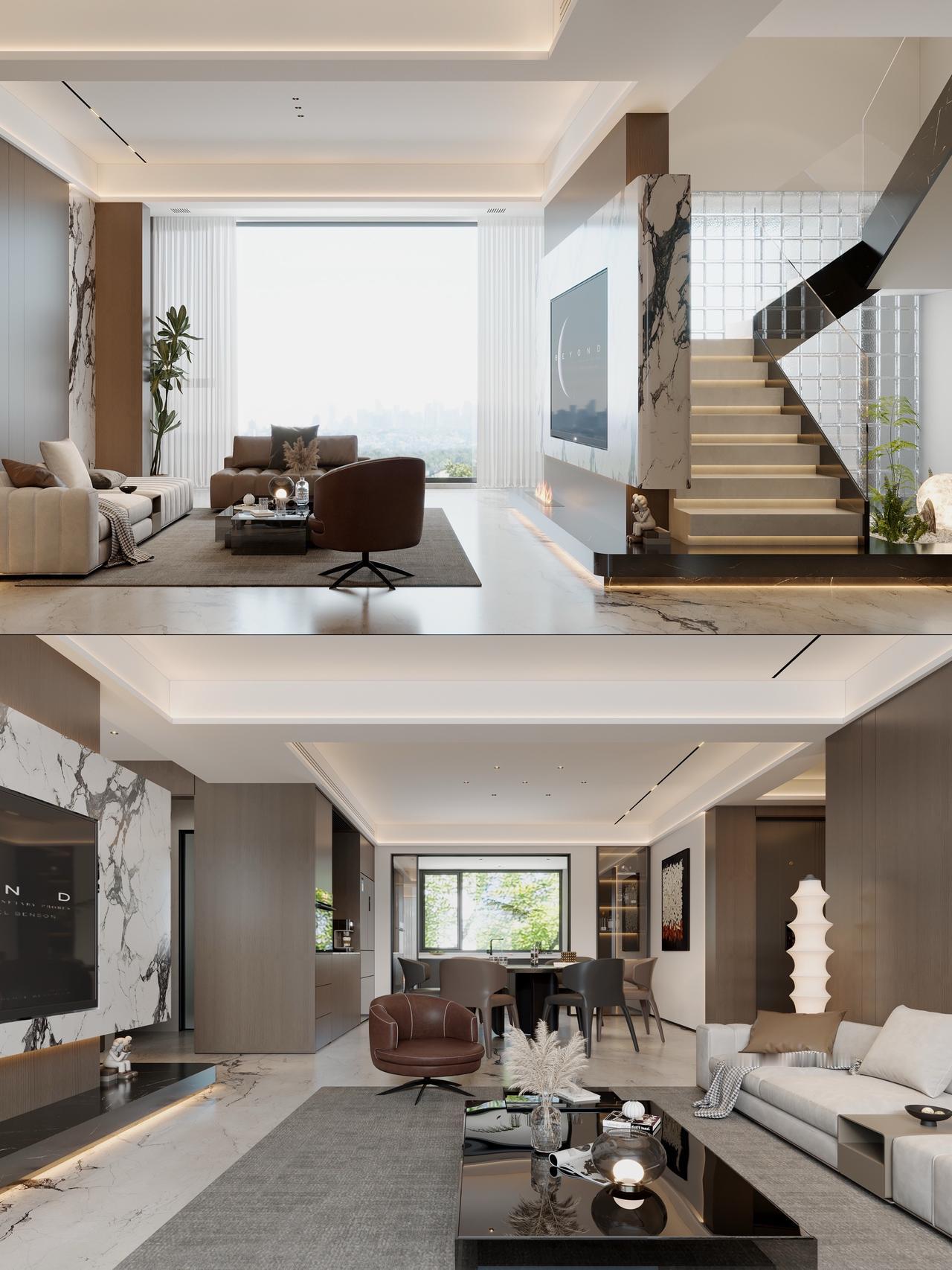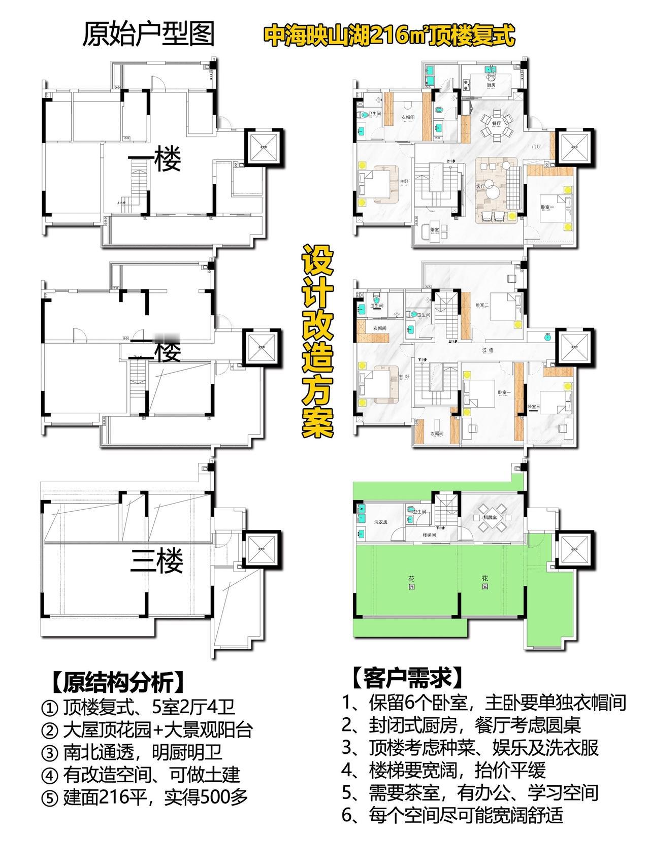 Hello!朋友们,又见面了!今天带给大家的设计案例是中海映山湖顶楼复式意式轻奢风!🍀 项目信息📋 📍楼盘:中海映山湖 🏠户型:顶楼复式(洋房) 📏面积:216㎡,实得500㎡ 🎨风格:意式轻奢风格 💰预算:30个左右 📝 【客户需求】 1、保留6个卧室,主卧要单独衣帽间 2、封闭式厨房,餐厅考虑圆桌 3、顶楼考虑种菜、娱乐及洗衣服 4、楼梯要宽阔,抬价平缓 5、需要茶室,有办公、学习空间 6、每个空间尽可能宽阔舒适 🏠 【原结构分析】 ① 顶楼复式、5室2厅4卫 ② 大屋顶花园+大景观阳台 ③ 南北通透,明厨明卫 ④ 有改造空间、可做土建 ⑤ 建面216平,实得500多平 ❗️接下来一起见证设计改造方案,以及设计效果图!意式轻奢风格尽显格调。公共区域以大理石元素与木质纹理碰撞,搭配简约大气的沙发、桌椅,营造出高级感与舒适感兼具的社交空间;厨房采用深色调橱柜,搭配明亮采光,实用又美观;卫浴空间线条简洁,智能洁具提升品质感。卧室延续整体风格,柔和灯光与精致软装结合,部分卧室还设有独立办公区,满足多元需求,每一处细节都诠释着意式轻奢的优雅与精致。 👉【关于我】 一位充满热情、细心、靠谱的90后设计师。拥有别墅、洋房、跃层、大平层、普通住宅10年设计经验。如果你正为装修设计发愁,希望我的设计与创意能为你排忧解难! ✅擅长风格 意式、新中式、现代简约、奶油风、宋式美学、中古风、法式风、现代轻奢等… 📄【个人案例】 中铁阅花溪|中铁逸都|中铁阅山湖|阅山湖云著|华润悦府|中海映山湖|茅台广场|美的林城|金融城|融创九樾府|中海印龙泉|华润九悦|龙湖天曜|龙湖湖山原著|万科鸣翠|万科麓山|铁建城|龙湖舜山府|远大美域|观山小区|建发和玺|保利公园 。。。。。。 贵阳装修 中海映山湖 顶楼复式 全案设计