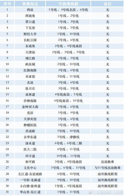【天津已开通10条地铁线路,有30多座换乘车站】目前,天津地铁已开通10条线路,运营车站超150座,其中同站换乘站20余座,加上2个出站换乘和4组站外换线联程,有30余座换乘车站。