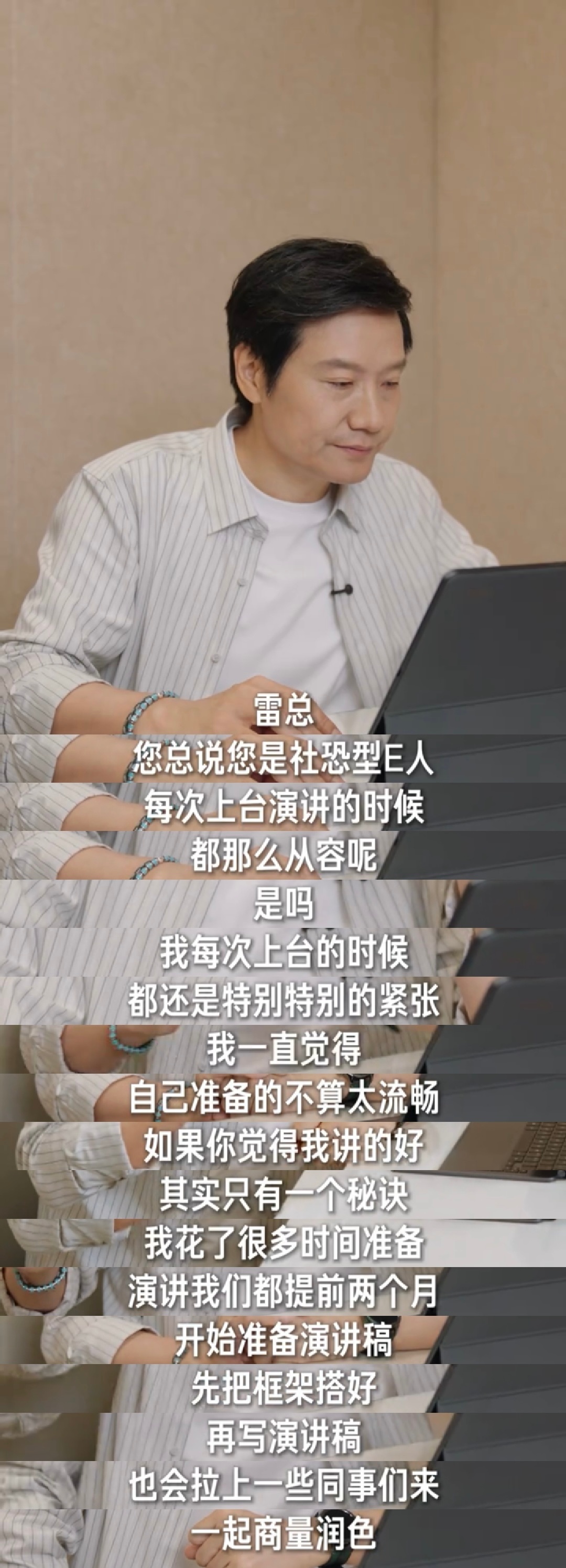 看得出来,雷总每次拍视频的时候还是有点害羞的哈哈哈。据说雷总的MBTI是ENFJ,可能是外倾指数不高,所以会社恐。但不得不说大佬就是大佬,能为了工作克服自己的社恐心理,换我非要上台去讲几个小时,我得紧张疯了[允悲]