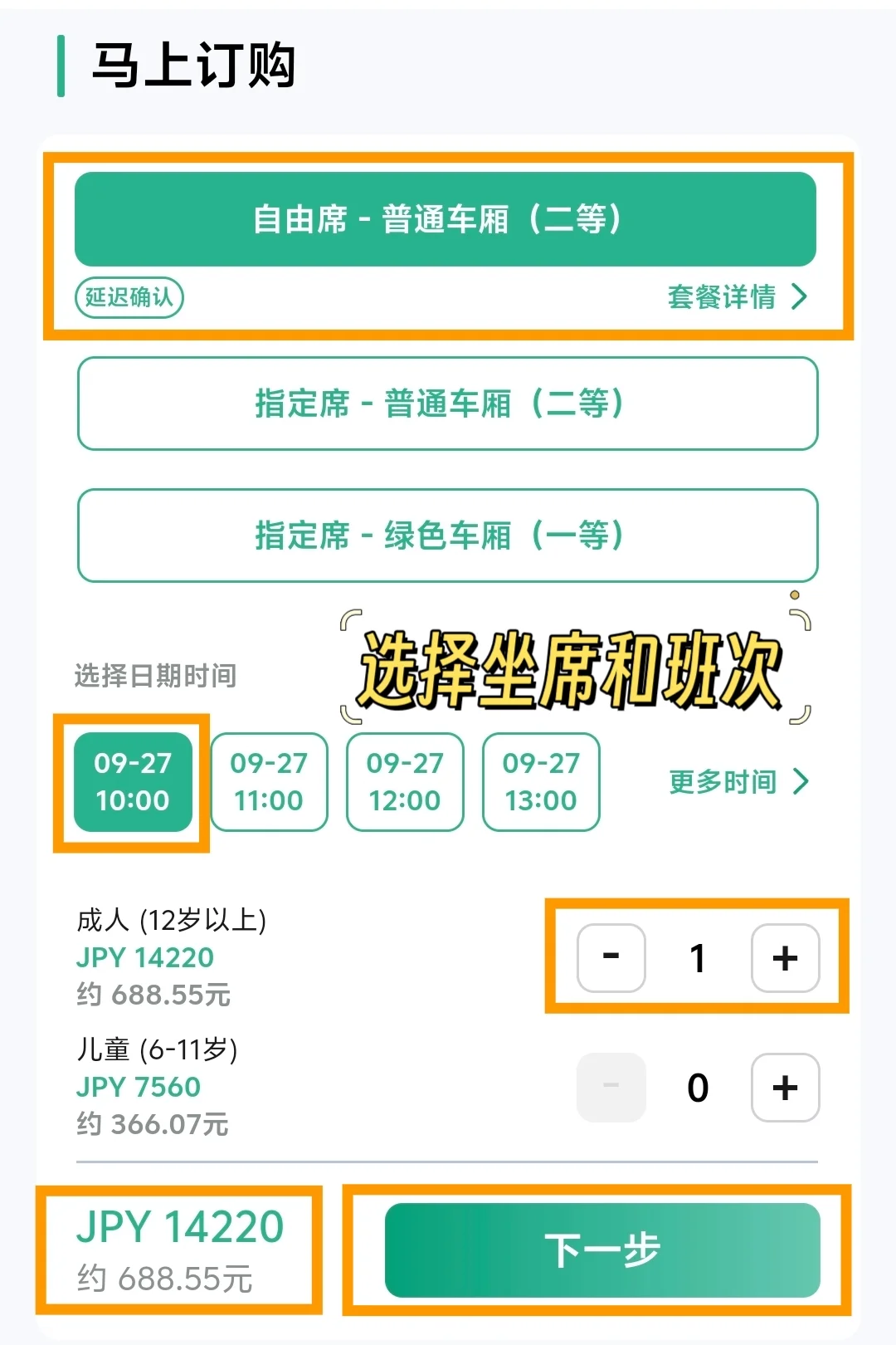 貌似默认订最快的Nozomi(2小时20分左右直达)班次密集不用等,全中文界面选日期、人数,行李额,不用担心语言卡壳