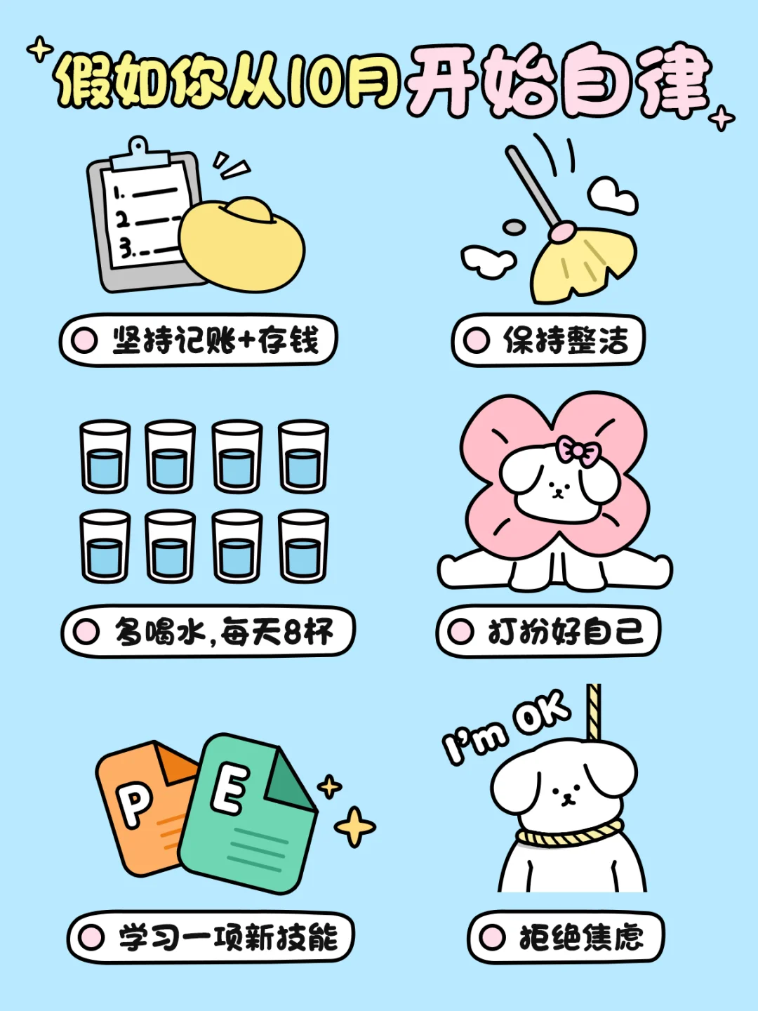 10月啦~ 自律了吗?坚持了吗?够卷了吗? 这个10月,按照我总结的这份清单去试着做! 养出自律体质,想不优秀都很难! 自律即自由~加油! 秀起来~ 女性成长 女生必看 健康养生 自律 自律女孩 自律打卡 爱自律的自己 努力成为更好的自己 成长 生活