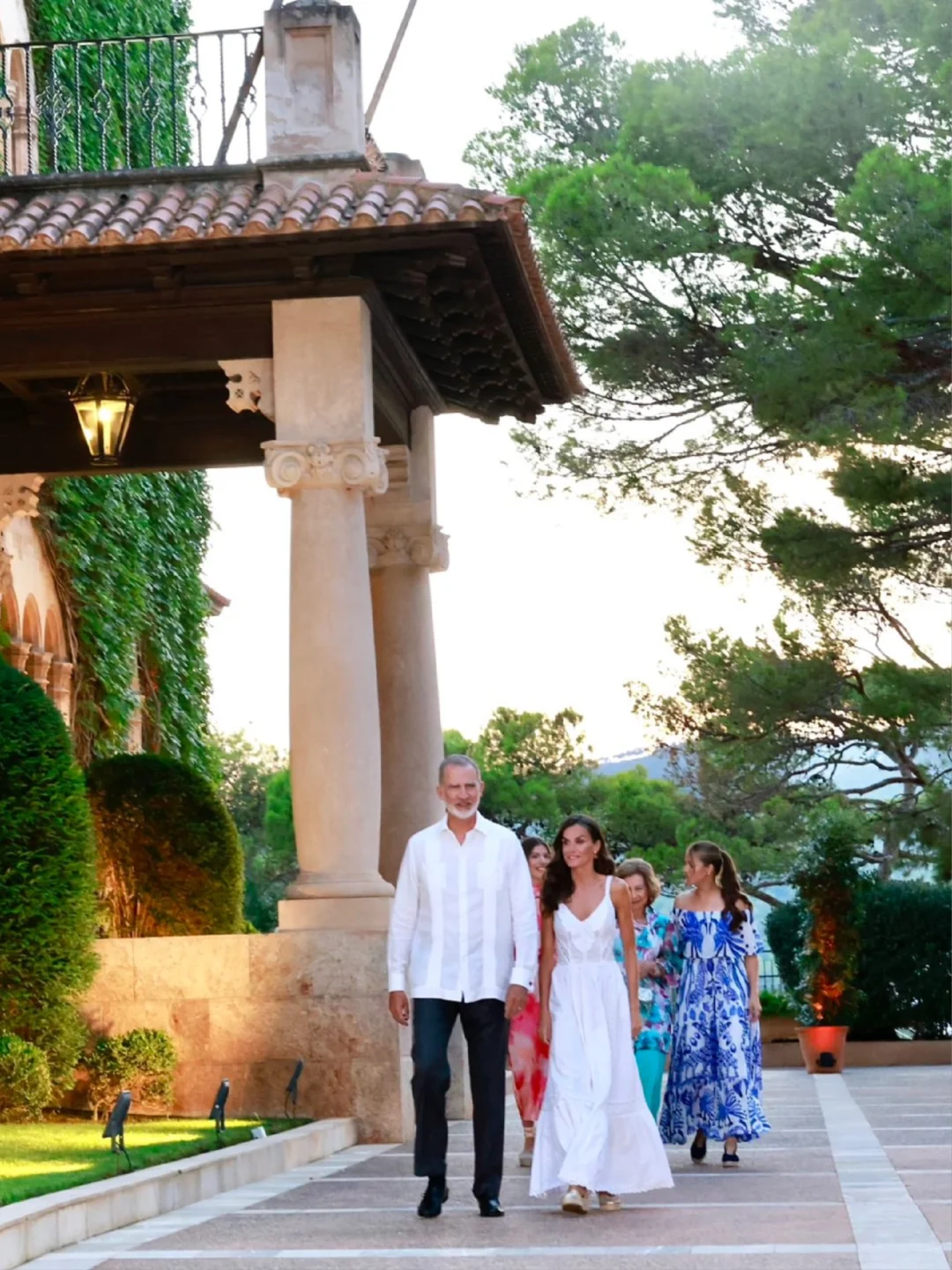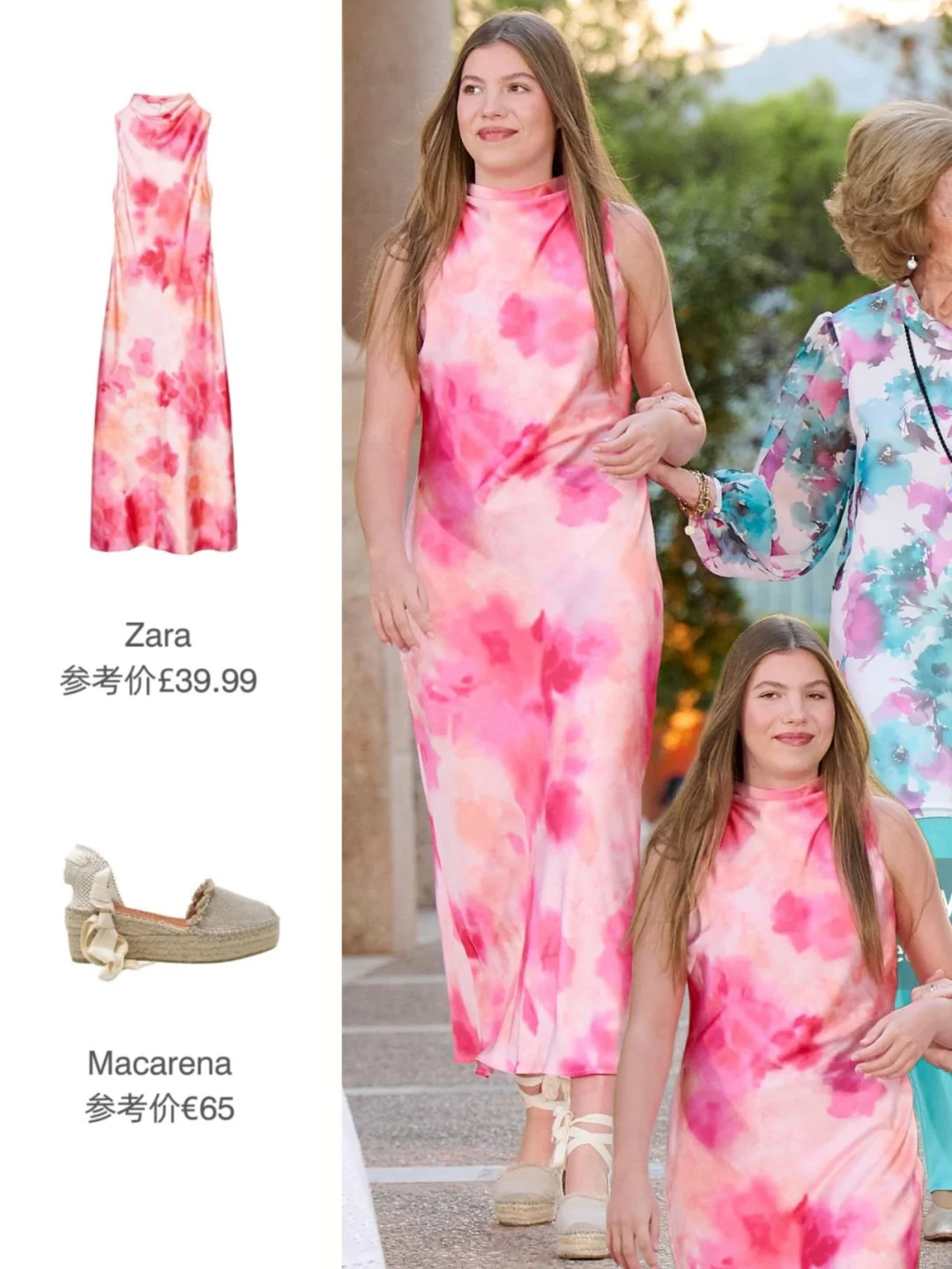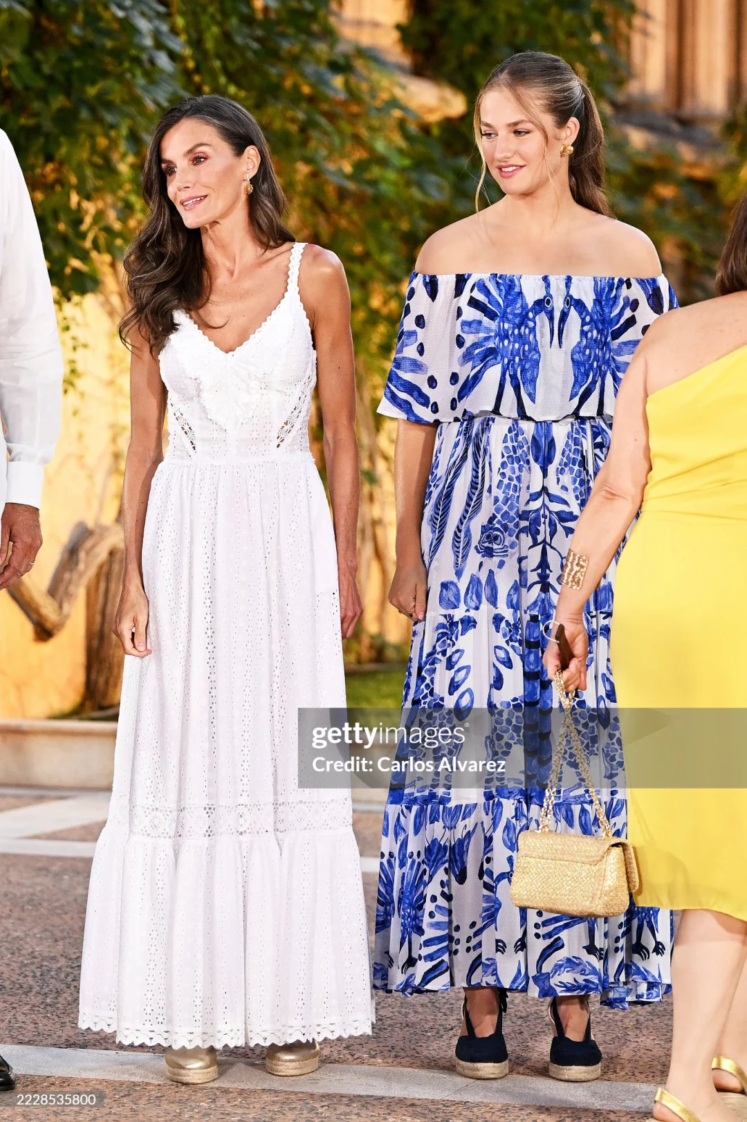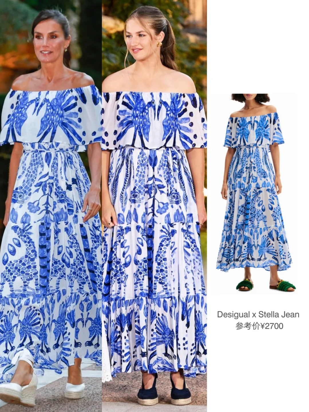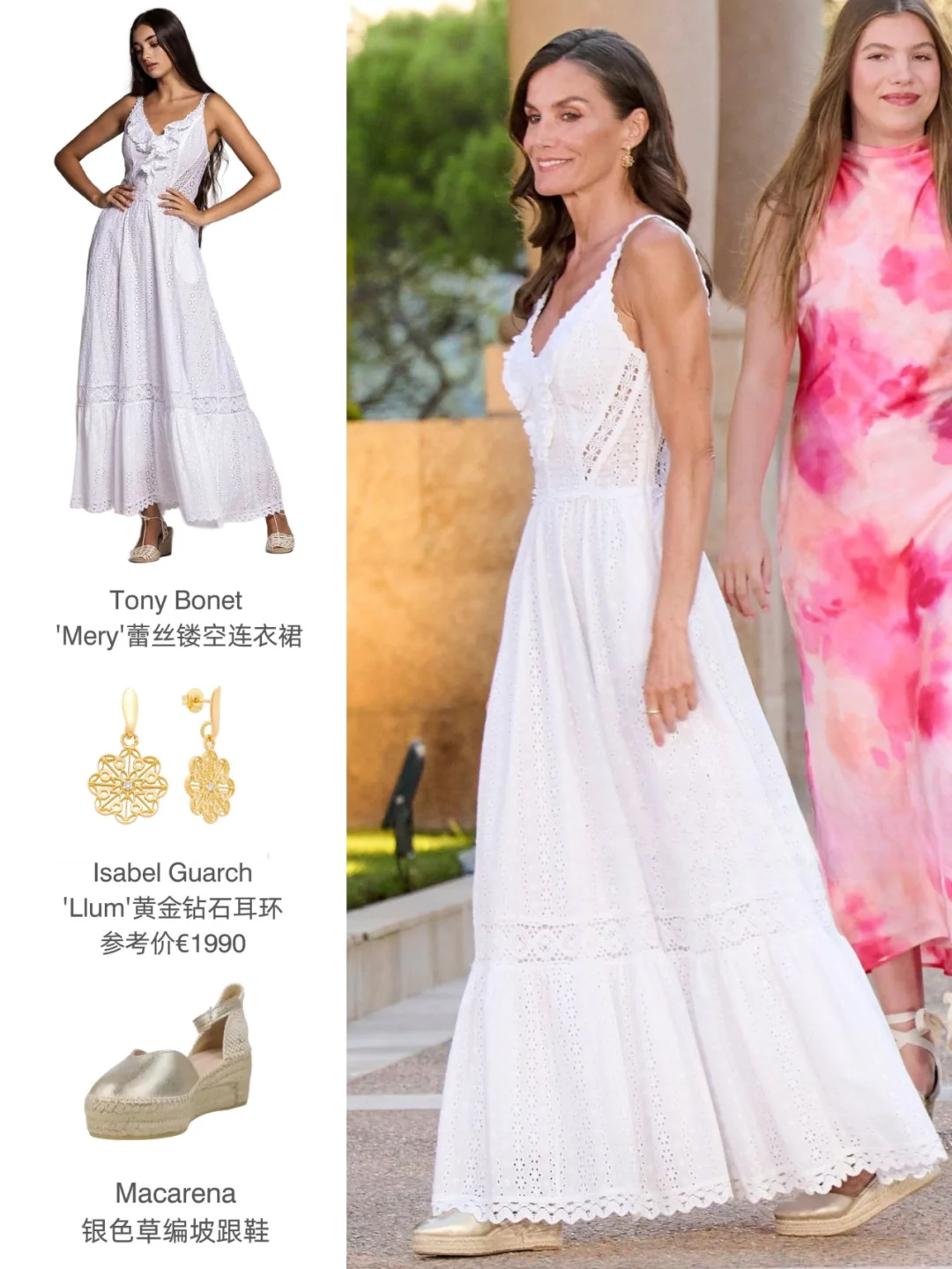 莱后身着Tony Bonet的白色蕾丝镂空连衣裙(近日尤为偏爱白色系),诺拉则再一次「淘妈妈衣服穿」,上身了莱后23年出席这一趴活动时穿过的Desigual与Stella Jean的联名合作款露肩裙,且还是搭配的Suma Cruz耳饰(新品,看得出是真爱了);索妹则又是一件Zara单品,搭配了她那双夏日必穿的Macarena。