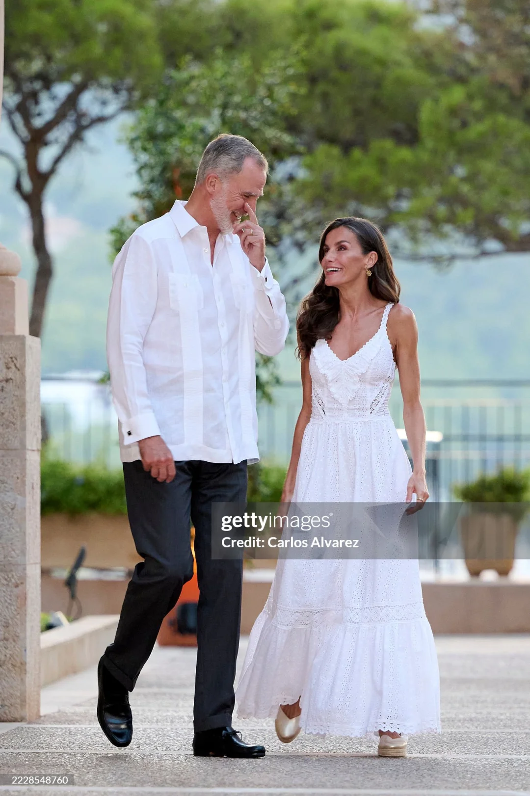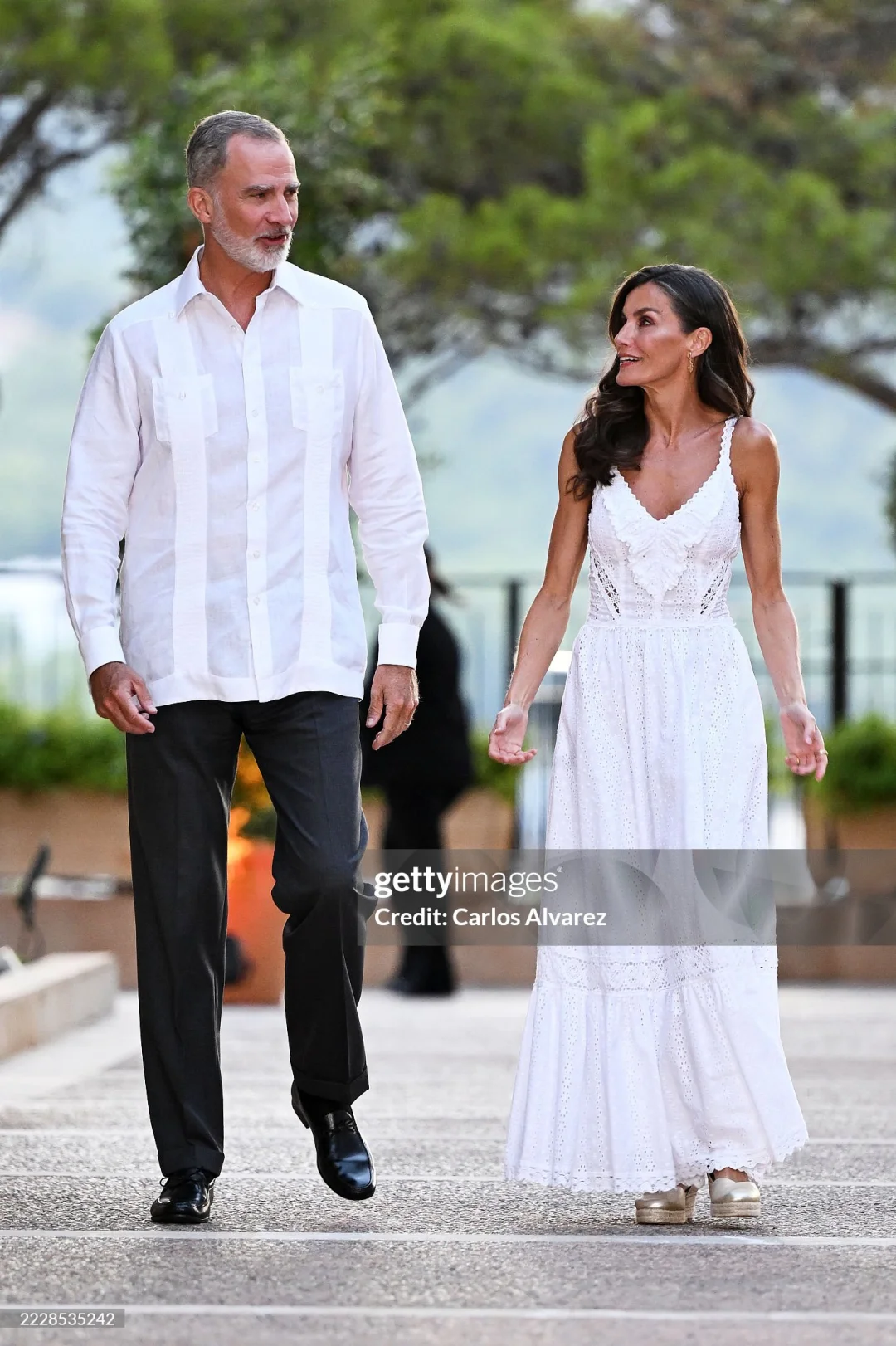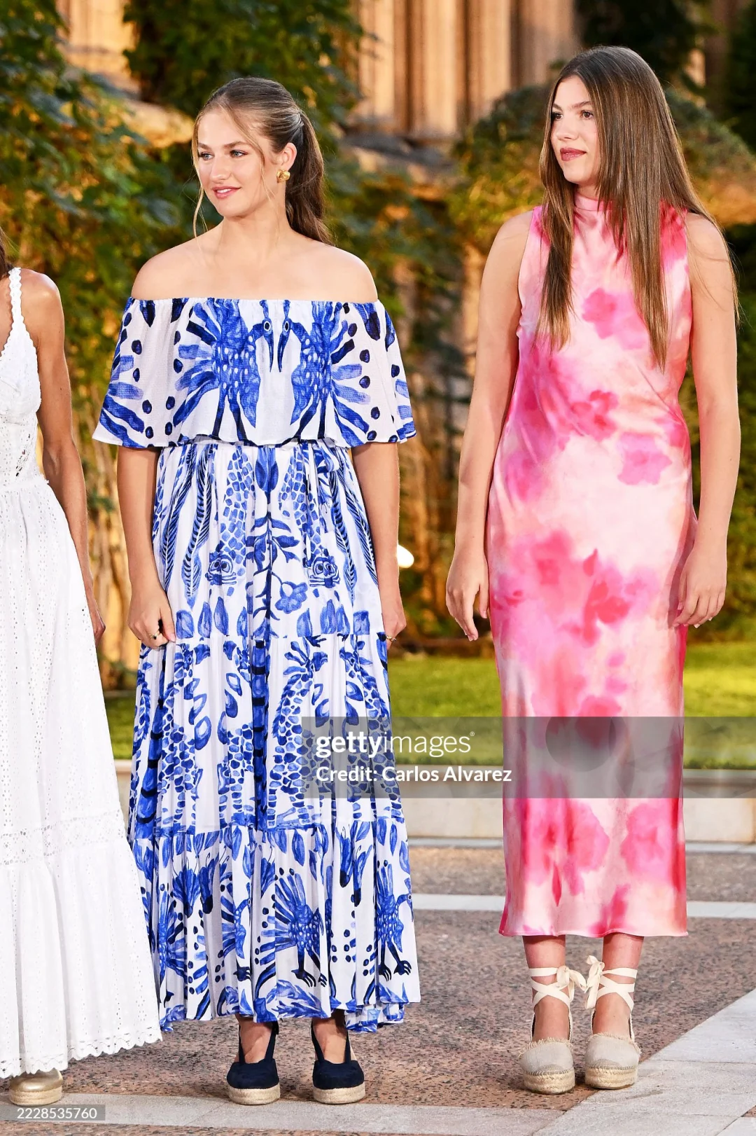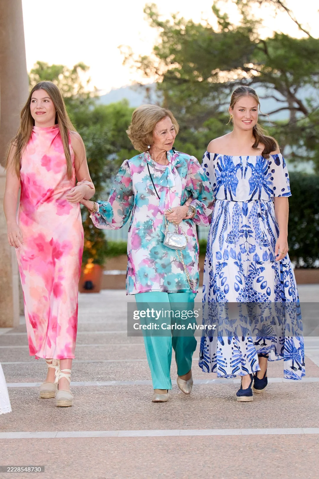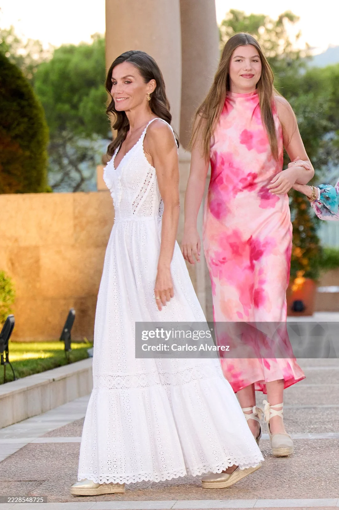 莱后身着Tony Bonet的白色蕾丝镂空连衣裙(近日尤为偏爱白色系),诺拉则再一次「淘妈妈衣服穿」,上身了莱后23年出席这一趴活动时穿过的Desigual与Stella Jean的联名合作款露肩裙,且还是搭配的Suma Cruz耳饰(新品,看得出是真爱了);索妹则又是一件Zara单品,搭配了她那双夏日必穿的Macarena。
