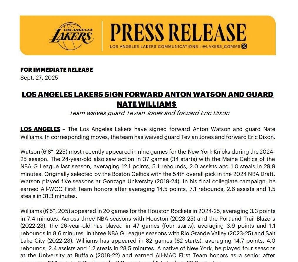 湖人宣布与沃特森签下训练营合同! 湖人于2025年9月28日宣布与安东沃特森正式
