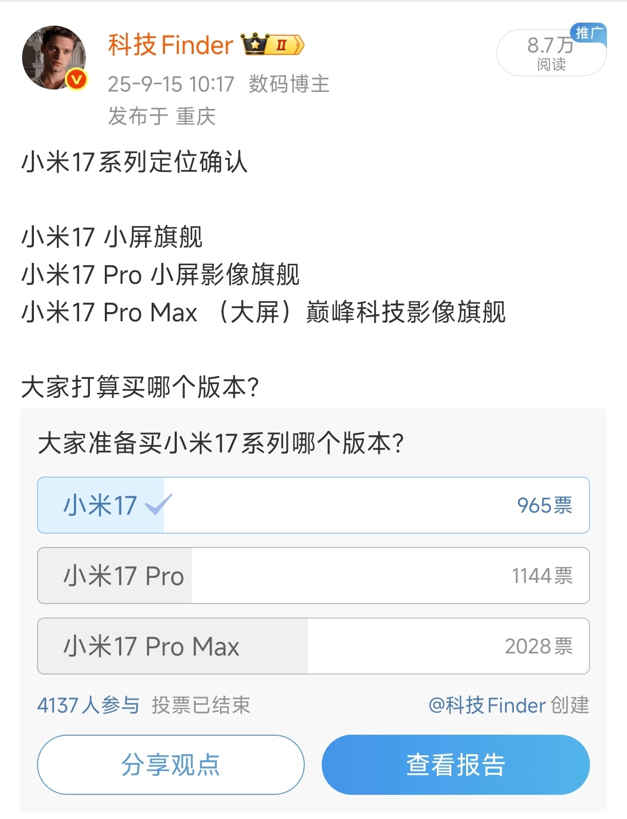 事实证明我这个身边统计学投票结果和最终小米17系列首销数据惊人地吻合,ProM