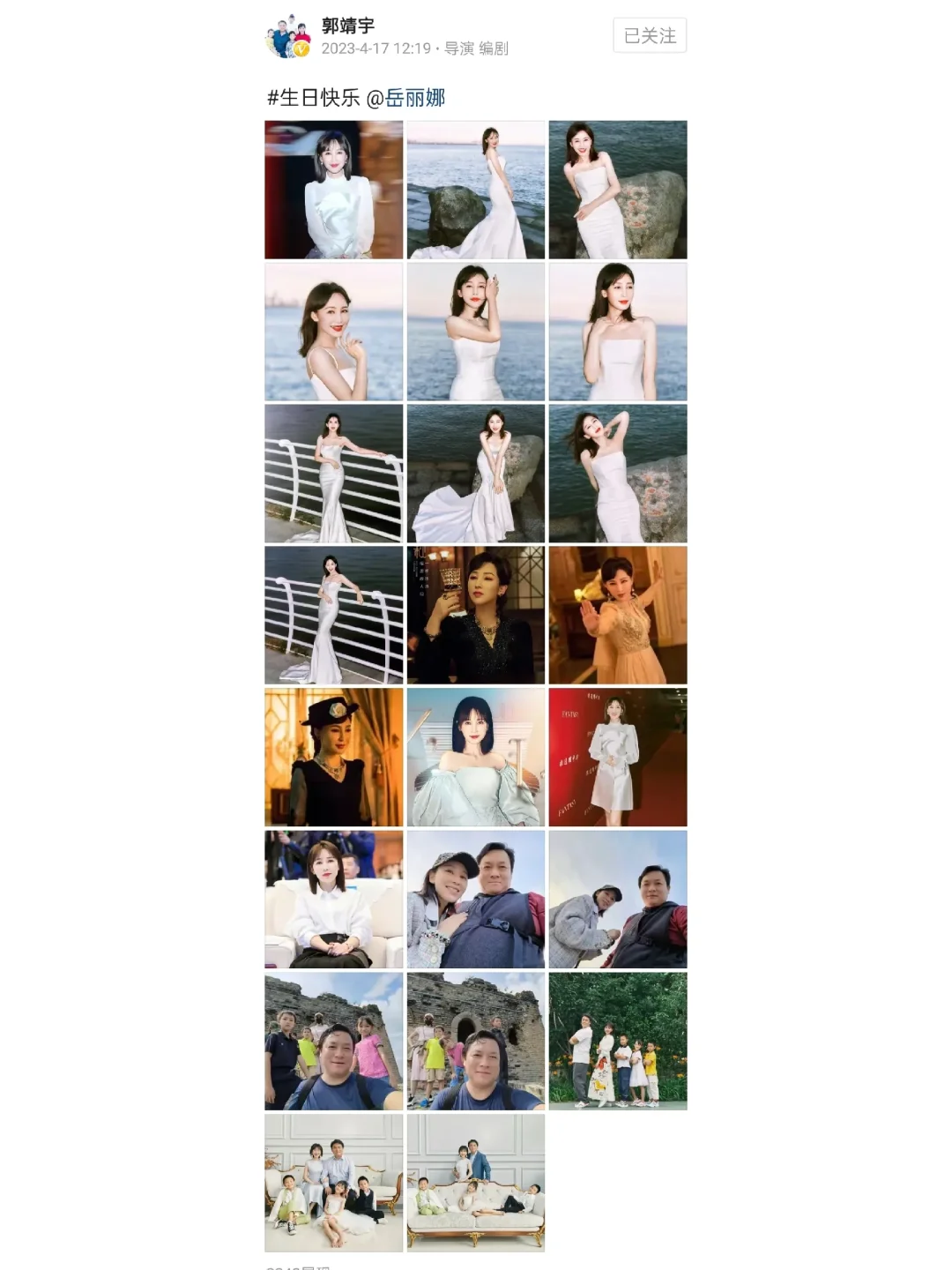 郭靖宇祝老婆岳丽娜生日快乐,一口气发了足足23张照片,其中有美女单人照,有夫妻合影,更有一家五口合照,主打的是一个甜蜜。