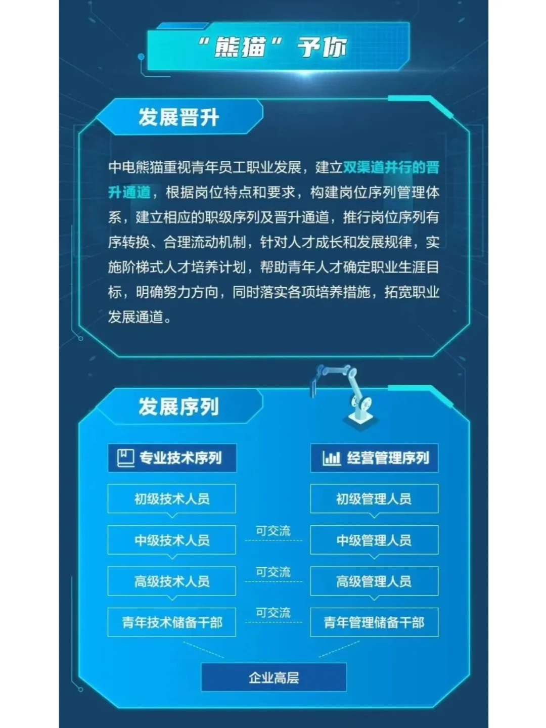 🔢中电熊猫重视青年员工职业发展,建立双渠道并行的晋升通道,根据岗位特点和要求,构建岗位序列管理体系,建立相应的职级序列及晋升通道,推行岗位序列有序转换、合理流动机制,针对人才成长和发展规律,实施阶梯式人才培养计划,帮助青年人才确定职业生涯目标,明确努力方向,同时落实各项培养措施,拓宽职业发展通道。