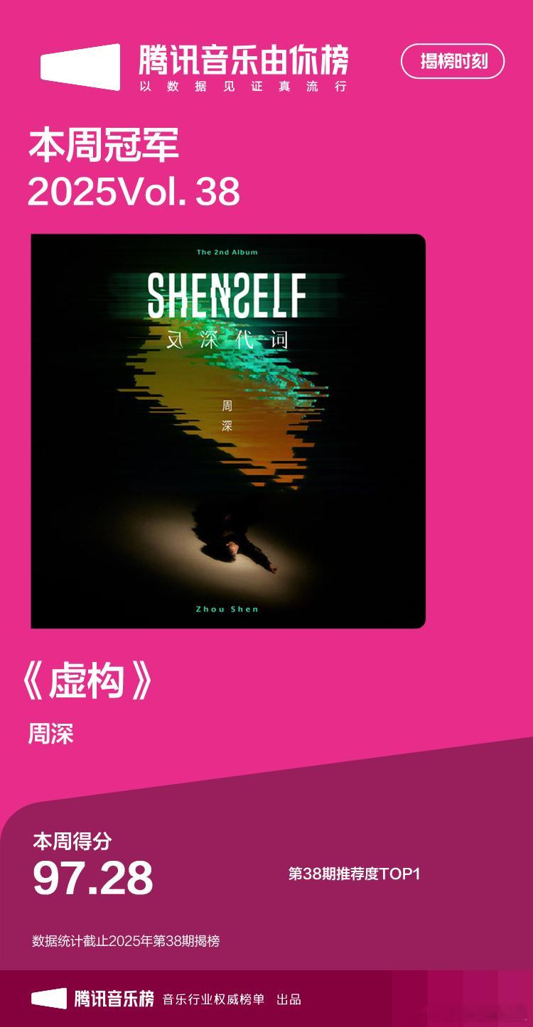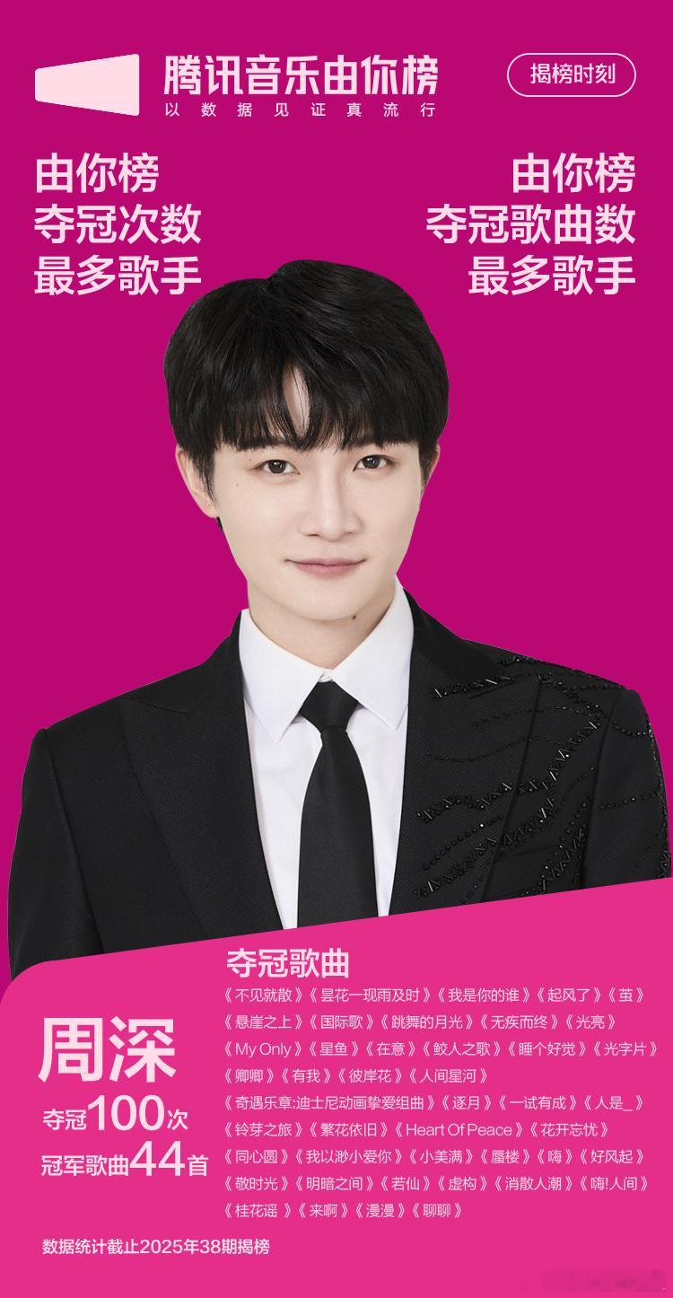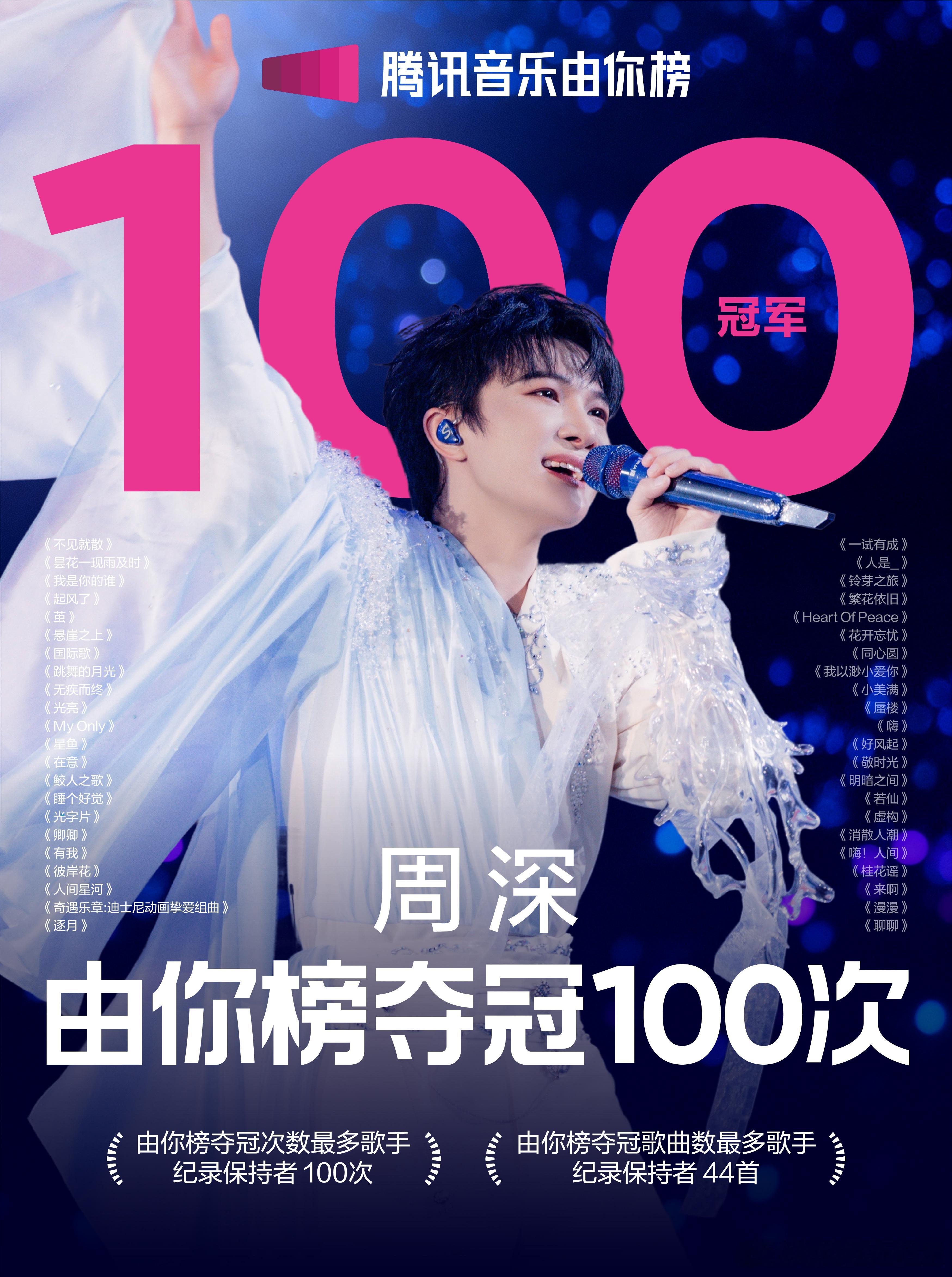 周深由你榜百冠第一人 家人们让我们恭喜周深成为腾讯音乐由你榜首位百冠歌手!用一首首好的音乐作品不断刷新自己的成绩单,不愧是口碑和热度的双重保障啊!我们的宝藏国民歌手,期待未来解锁更多纪录!我说下一首冠军单曲,已经在路上了吧~周深由你榜首位百冠歌手