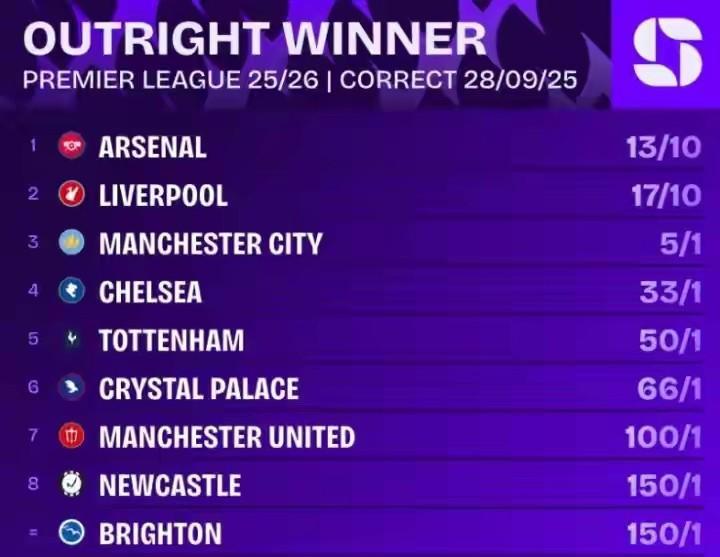 我厂英超夺冠赔率第一!阿森纳逆转2:1绝杀纽卡,魔鬼赛程长分迅猛。利物浦1:2不