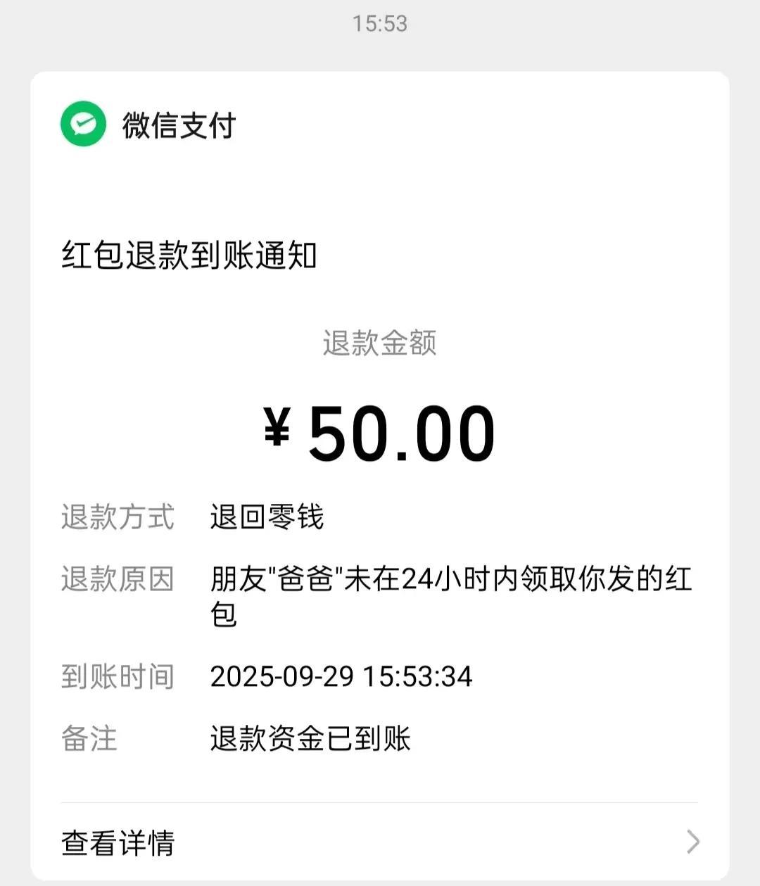 我老公终于有骨气了一次,给他50块钱,人家都不要。 昨天我发信息给孩子他爸爸,跟他说电瓶不行了,让他给点钱换电瓶。 但他却反过来说,他连吃饭的钱都没有,还说想去打针,都没钱去打针(好像他这段时间一直去打针,就是整天胡吃海喝,又喝酒又吃海鲜,引发痛风了) 在这样的情况下,我都不想搭理他了,后面他又打电话问说饿了整整一天,真的连一口饭都没有钱买…… 看他那么可怜的样,后面想想我就决定给他转50块钱,这已经是我最大的慈悲了,因为我自己本身也没有钱,我连换电瓶的钱都没有呢。 转给他50块钱后,我原以为他会马上领红包的,可是不知道怎么回事,也不见他领红包。 我猜想可能是不好意思立马领吧,但这个红包他肯定会领的,因为他都饿一天了。 可是从昨天下午发红包到今天,也不见他领红包,那我又猜想着他肯定会在24小时退款前领红包的,因为白拿的钱怎么可能会不要呢? 可是就在今天下午将近4点钟的时候,我收到红包的退款信息了,上面显示着他没有领我的红包,已经自动退款了。 看到已经自动退回来的50块钱,我觉得心里有些不安,莫非是这个人饿了一天饿晕过去了?不过也不应该呀,不是说一个人在不吃不喝,至少也能撑过五六天吗?这才一天呐,不可能饿晕的。 那么在不可能饿晕的情况下,就只有一种情况退回来钱,那就是他有骨气了,可能是觉得他都没有给够抚养费,所以也就不好意思要我给他的钱吧,应该是这样的。 哎呀,我原以为他会立马领着50块钱去买饮料和抽烟,剩下的钱就吃个快餐,但没想到人家真的有骨气了,连我的红包都不领了(我没跟他说是50块) 哎呀,其实昨天给他发了50块钱的红包后,我也是很后悔的,因为那是我一天的工资啊,但当时又心软,所以就给了50块钱,不过好在他没有拿我的钱,不然的话,我要念叨好久了。 哎呀,我的50块钱回来了,有一种失而复得的感觉,那种感觉真是太好了。